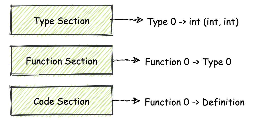 Type Section 存放了 Wasm 模块使用到的所有函数类型(签名);Function Section 存放了模块内每个函数对应的函数类型,即具体的函数与类型对应关系;而在 Code Section 中存放的则是每个函数的具体定义,也就是实现部分。