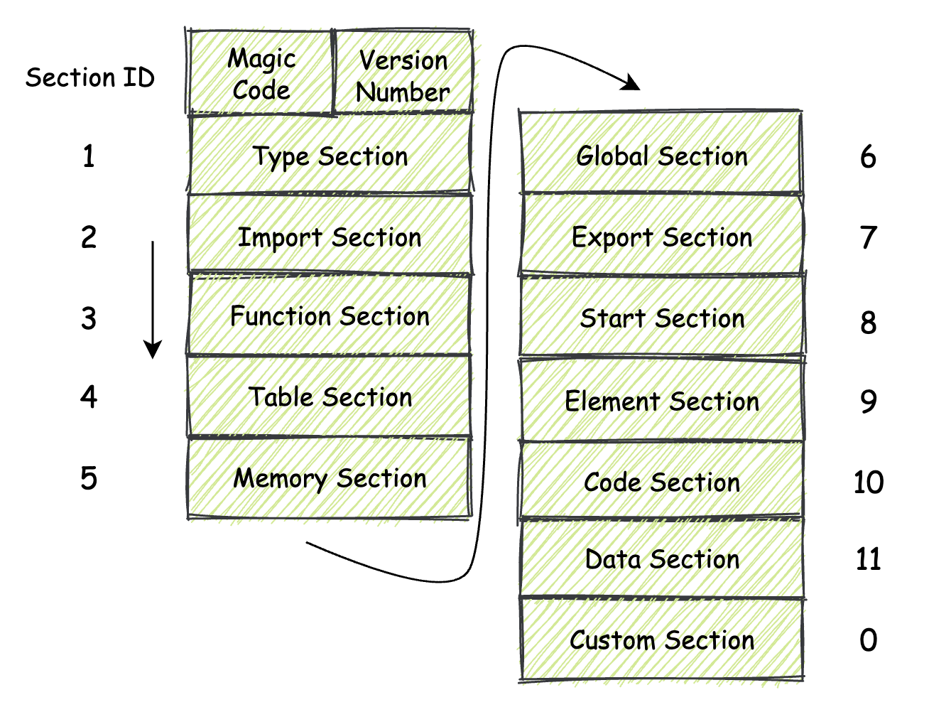 要注意的是,在我们接下来将要讲解的这些 Section 中,除了其中名为 “Custom Secton”,也就是“自定义段”这个 Section 之外,其他的 Section 均需要按照每个 Section 所专有的 Section ID,按照这个 ID 从小到大的顺序,在模块的低地址位到高地址位方向依次进行“摆放”。下面我来分别讲解一下这些基本 Section 的作用和结构。