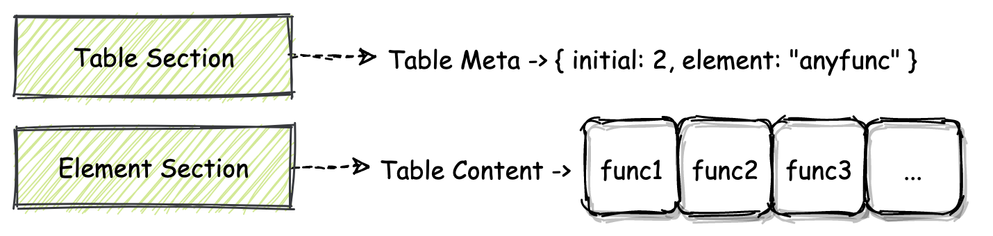 值得说的一点是,在实际的 VM 实现中,虚拟机会将模块的 Table 结构,初始化在独立于模块线性内存的区域中,这个区域无法被模块本身直接访问。因此 Table 中这些“小格子”内具体存放的值,对于 Wasm 模块本身来说是不可见的。