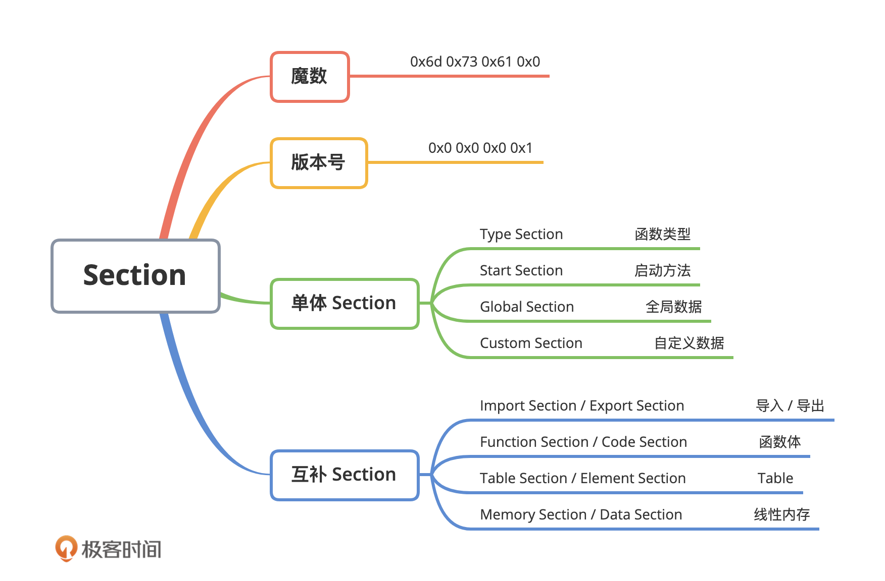 从整体上来看,同 ELF 二进制文件类似,Wasm 模块的二进制数据也是以 Section 的形式被安排和存放的。Section 翻译成中文是“段”,但为了保证讲解的严谨性,以及你在理解上的准确性,后文我会直接使用它的英文名词 Section。