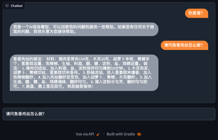- 可以看到,在回答里它说自己可以回答做菜的问题,而且回答都在100个字以内。