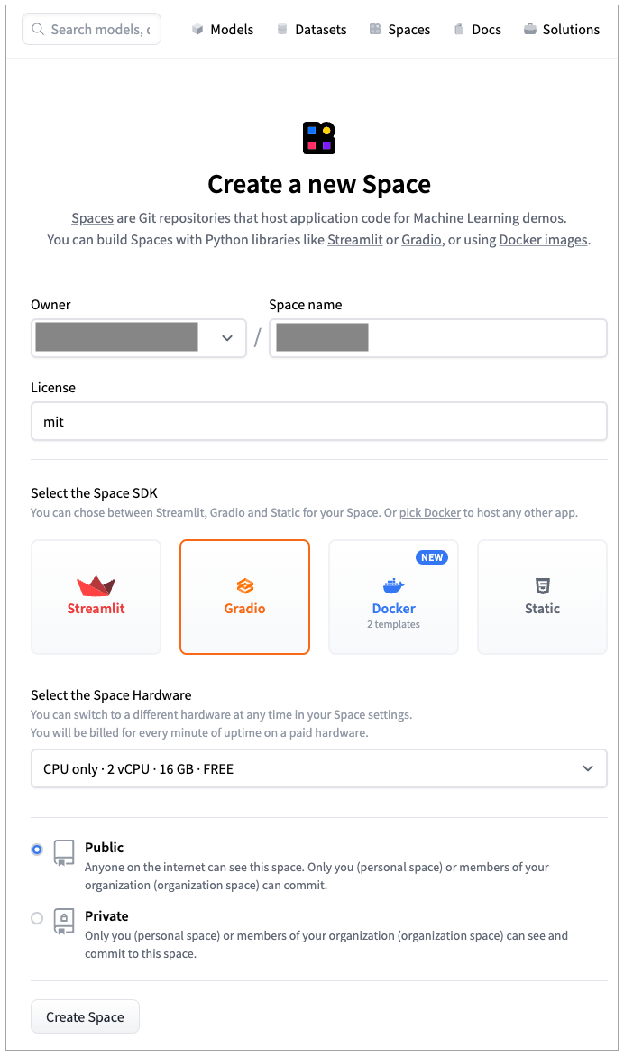 - 在接下来的界面里,给你的Space取一个名字,然后在Select the Space SDK里面,选择第二个Gradio。硬件我们在这里就选择免费的,项目我们在这里选择public,让其他人也能够看到。不过要注意,public的space,是连你后面上传的代码也能够看到的。
