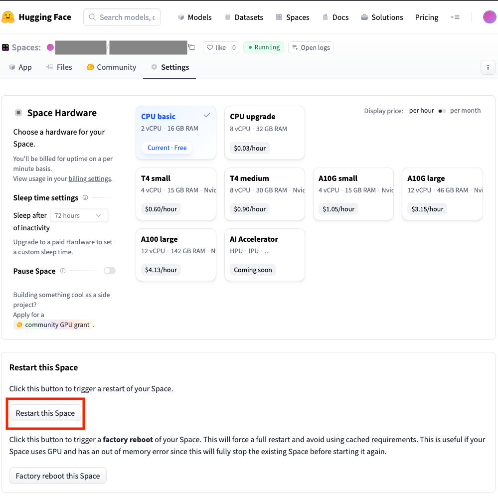 - 设置完成之后,你还需要点击一下Restart this space确保这个应用重新加载一遍,以获取到新设置的环境变量。