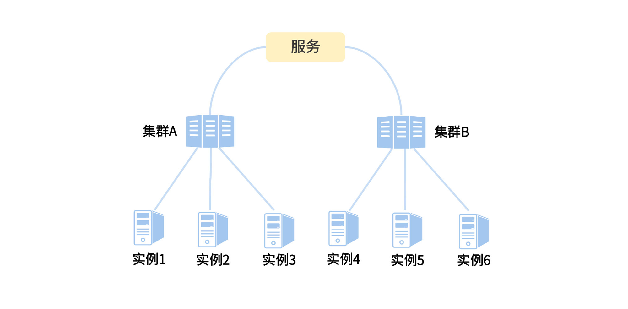 “服务”是Nacos中位于最上层的概念,在服务之下,还有集群和实例的概念。为了方便你理解这三者的层级关系,我画了一张图,你可以参考一下。