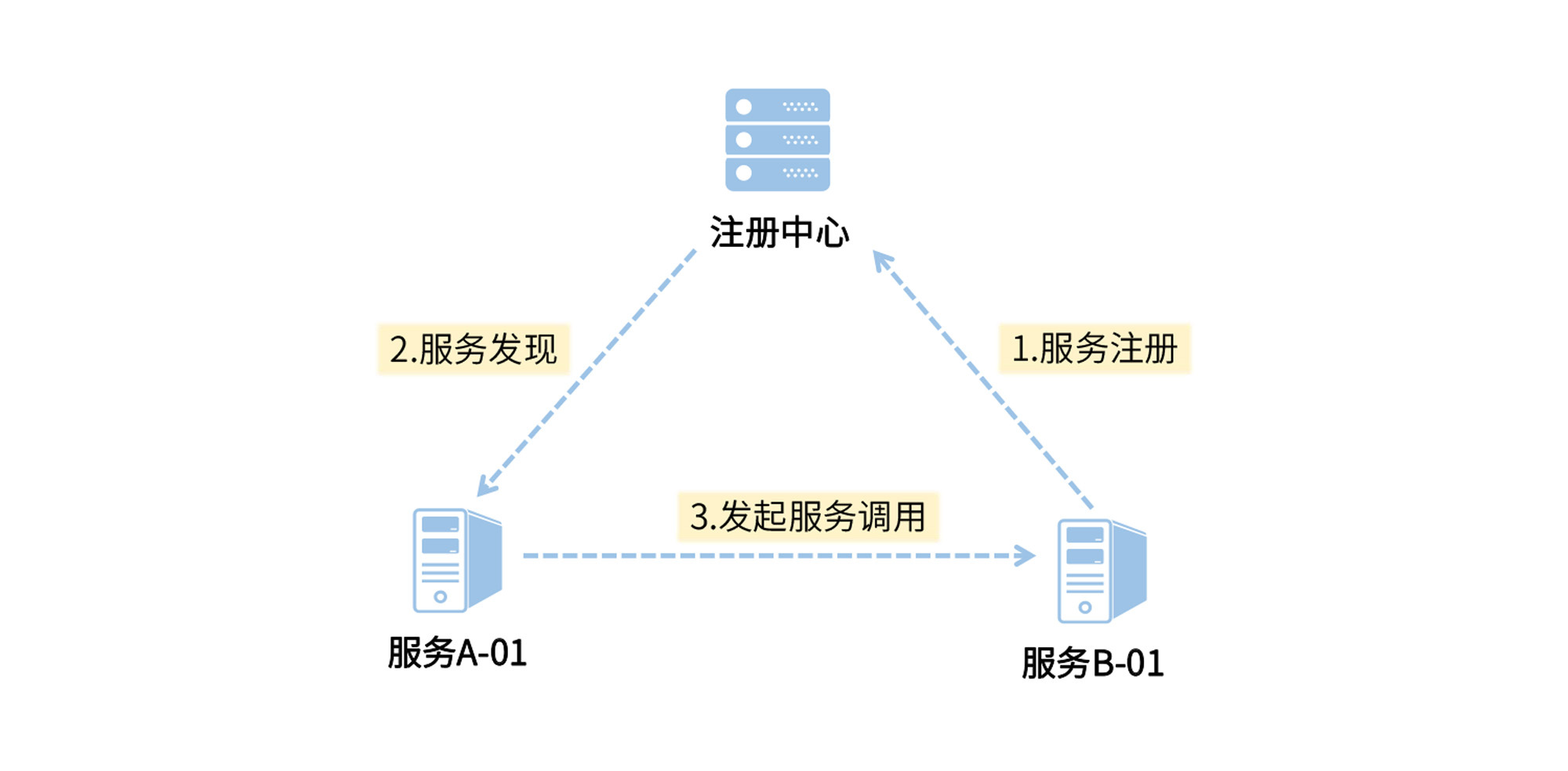 从上图中的步骤中我们可以看出,首先,服务B集群向注册中心发起了注册,将自己的地址信息上报到注册中心,这个过程就是服务注册。接下来,每隔一段时间,服务A就会从服务中心获取服务B集群的服务列表,或者由服务中心将服务列表的变动推送给服务A,这个过程叫做服务发现;最后,服务A根据本地负载均衡策略,从服务列表中选取某一个服务B的节点,发起服务调用。
