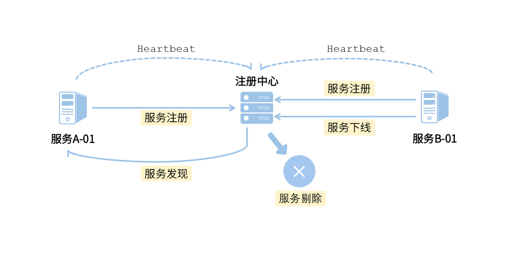 先说一个大前提。所有的服务都要在注册中心进行注册,而且每个节点都需要每隔一段时间向注册中心同步自己当前的状态,我们很形象地称这个过程为heartbeat(心跳)。