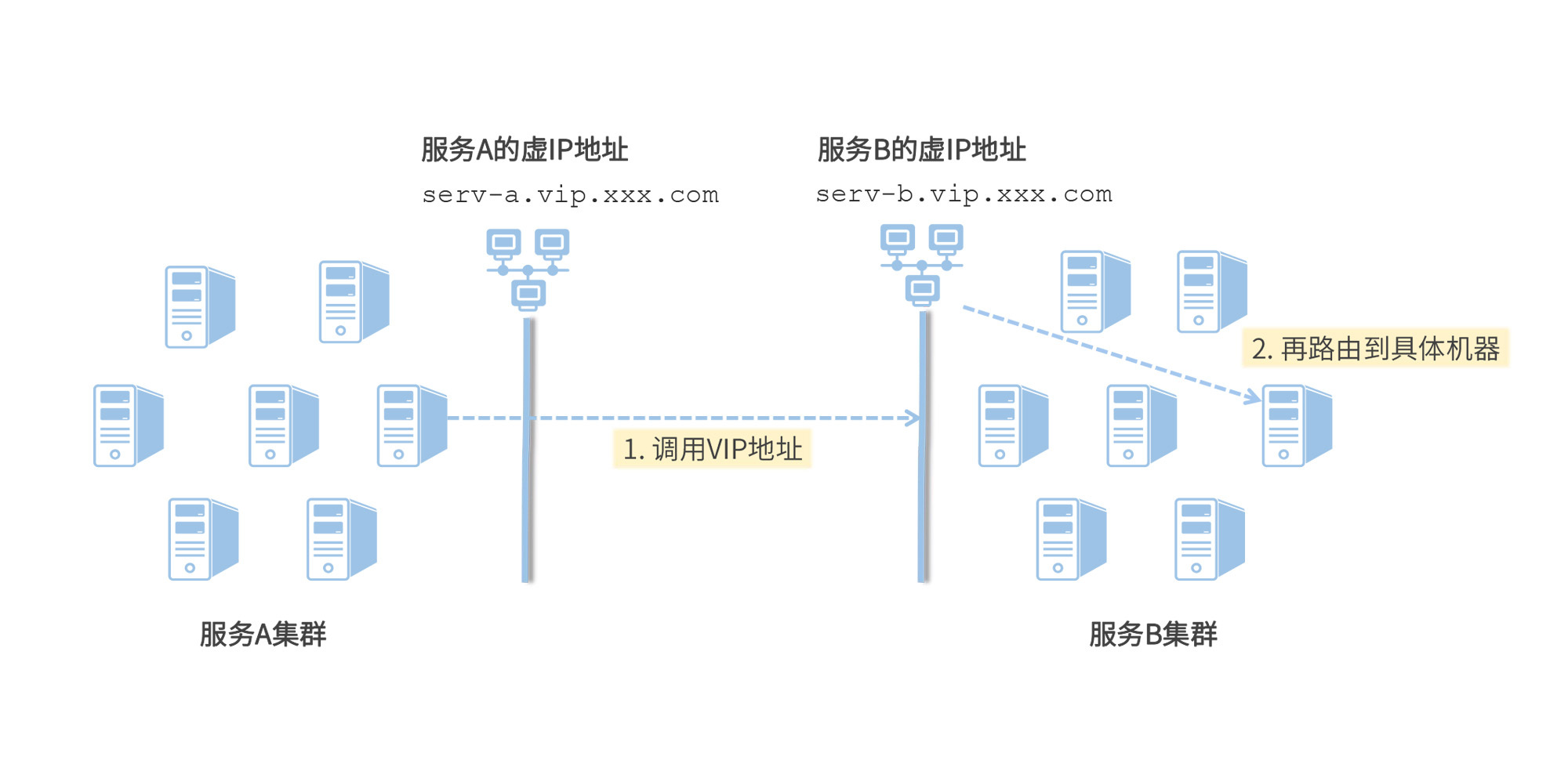 一种通用做法是:在服务A的配置文件中添加一个指向服务B的地址,但这个地址并不直接指向任何一台服务B集群中的节点,而是指向一个VIP(虚拟IP地址)或者是一个网关。这个VIP或网关背后维护了B集群的服务节点列表,VIP层通过负载均衡策略再将请求转到后面配置的某一台服务器。我画了一幅图来描述这个服务调用过程。