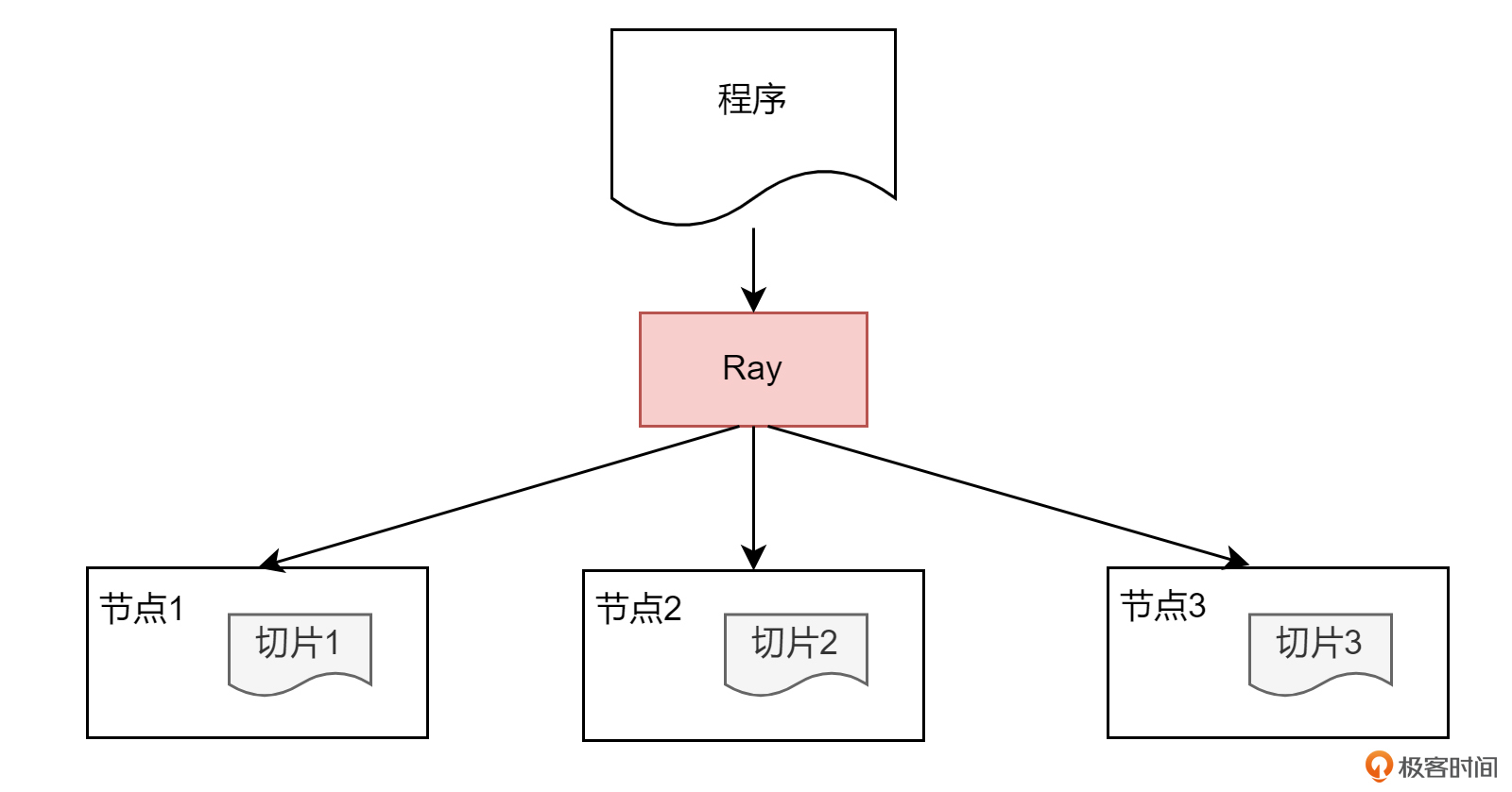 如下图所示,便是程序通过 Ray 的处理之后,在三个节点上分布式运行的一个简单示意图。Ray 会将程序拆分成多片,分布到多个节点去运行。