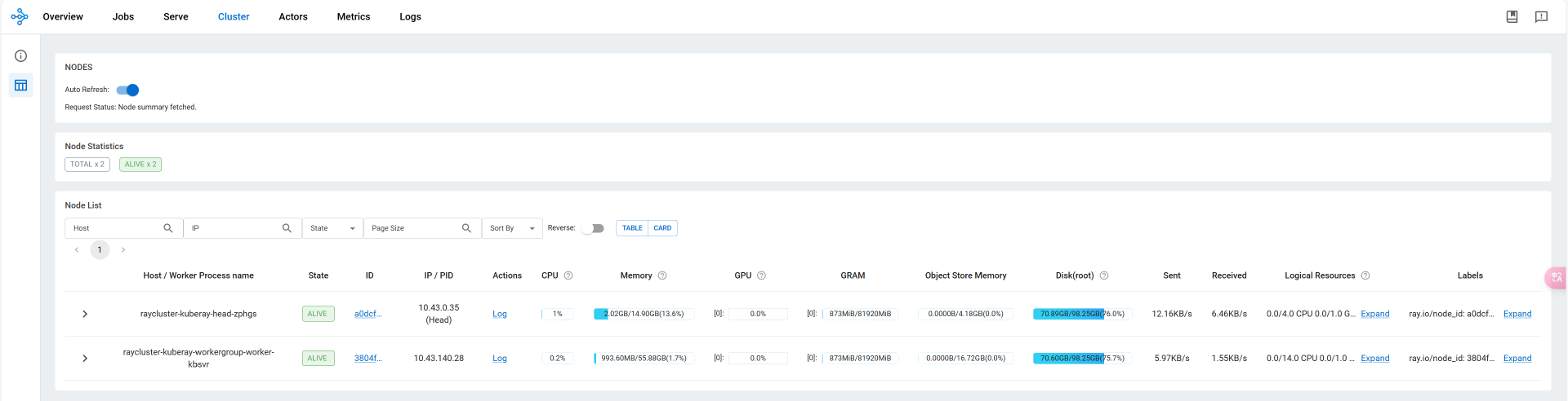 这时我们再看一下 Ray 集群情况:
