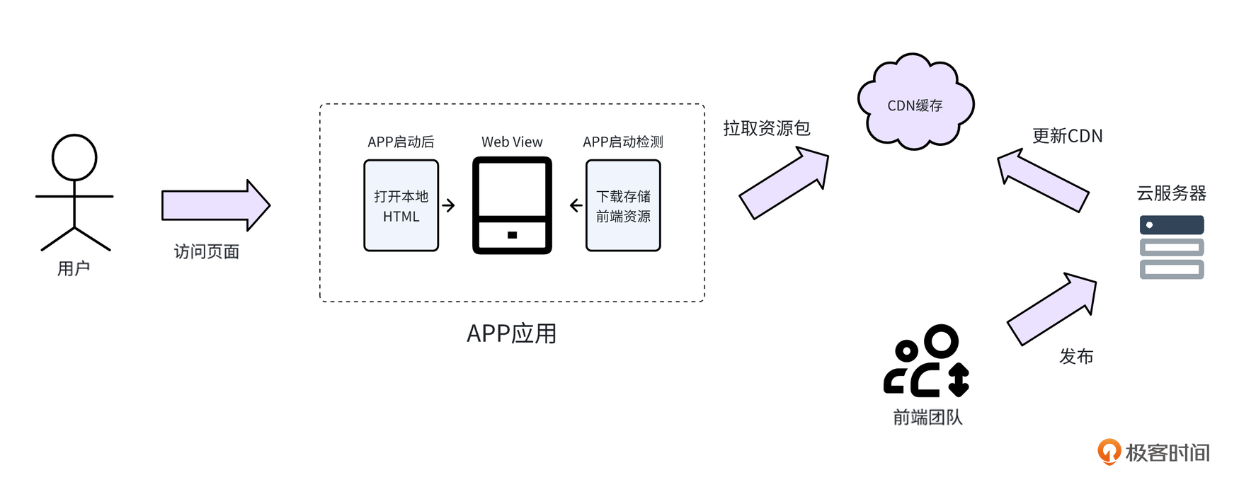因此,第二个优化白屏时间的方案是,在App支持热更新的同时,结合前端SPA单页面开发模式,最后打包一份可以在本地运行的前端代码,并下载到App内本地运行。具体的设计图如下。