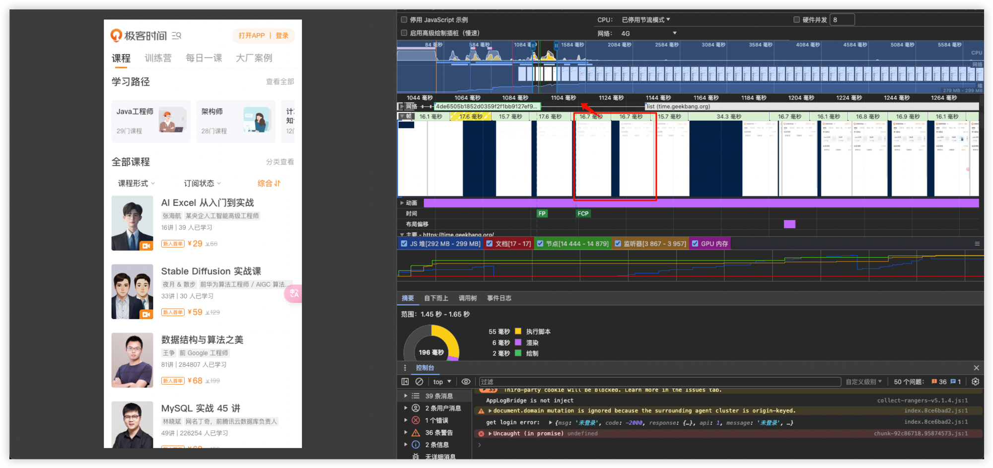 图中的红框表示开始看到页面内容的时间点,下面对应的是FCP(首次内容绘制)指标,这表示开始绘制页面内容。