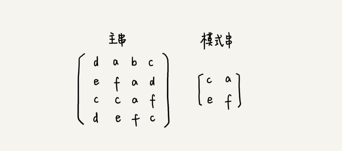 我们今天讲的都是一维字符串的匹配方法,实际上,这两种算法都可以类比到二维空间。假设有下面这样一个二维字符串矩阵(图中的主串),借助今天讲的处理思路,如何在其中查找另一个二维字符串矩阵(图中的模式串)呢?