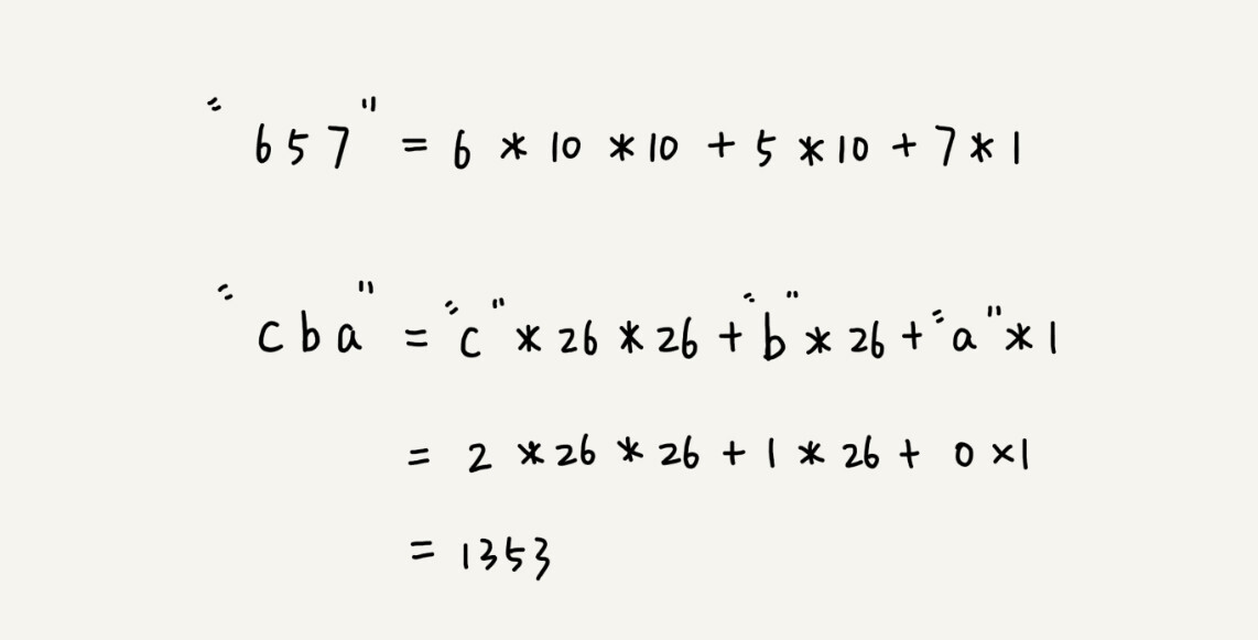 在十进制的表示法中,一个数字的值是通过下面的方式计算出来的。对应到二十六进制,一个包含a到z这26个字符的字符串,计算哈希的时候,我们只需要把进位从10改成26就可以。