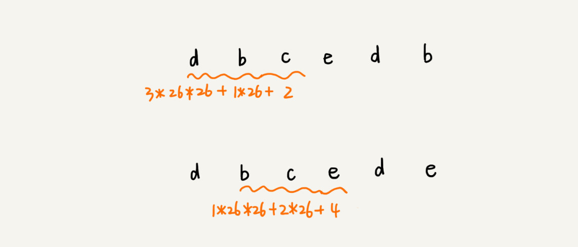 这种哈希算法有一个特点,在主串中,相邻两个子串的哈希值的计算公式有一定关系。我这有个例子,你先找一下规律,再来看我后面的讲解。
