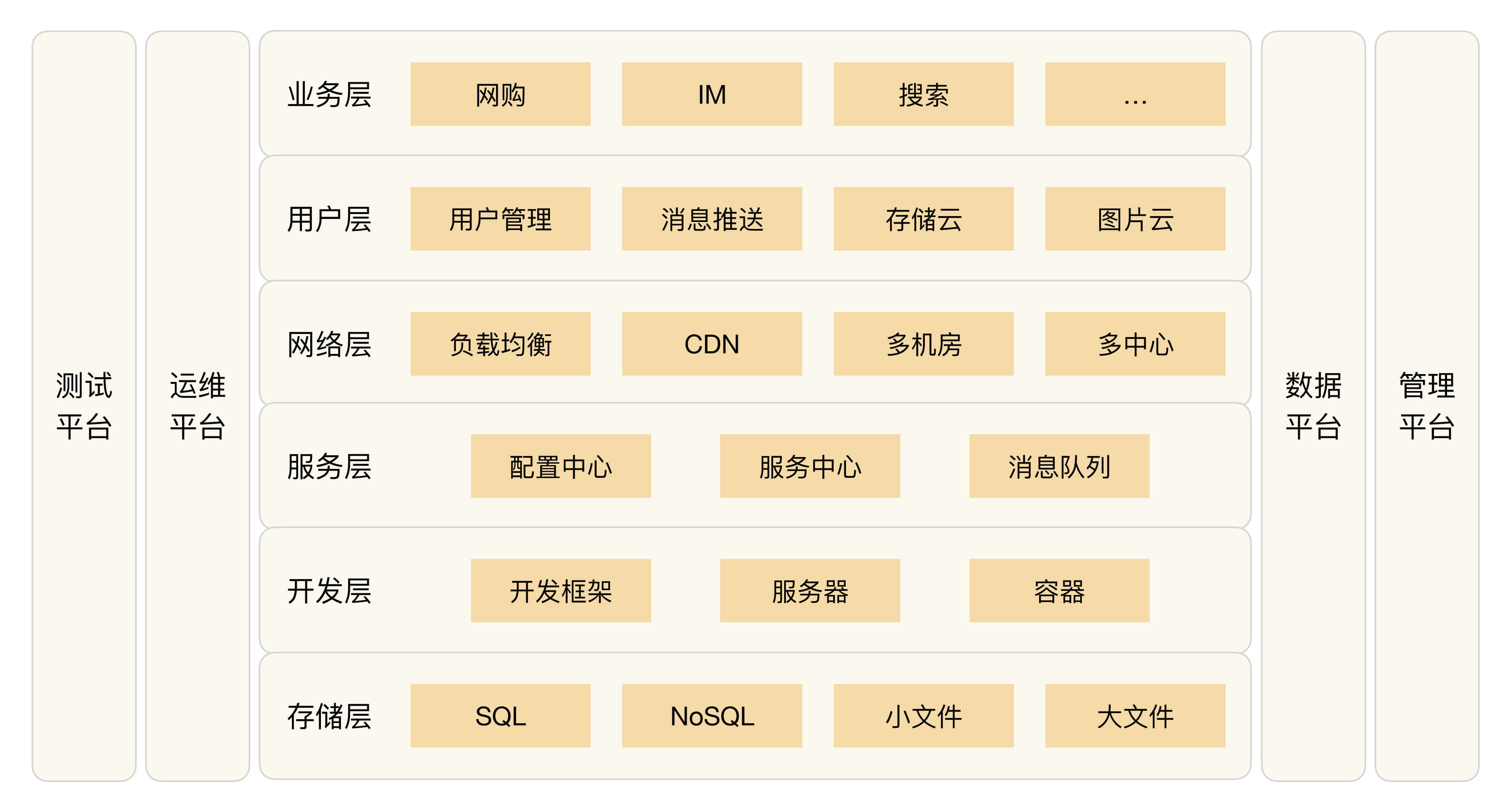 从本期开始,我将逐层介绍每个技术点的产生背景、应用场景、关键技术,有的技术点可能已经在前面的架构模式部分有所涉及,因此就不再详细展开技术细节了,而是将关键技术点分门别类,进而形成一张架构大图,让架构师对一个公司的整体技术架构有一个完整的全貌认知。