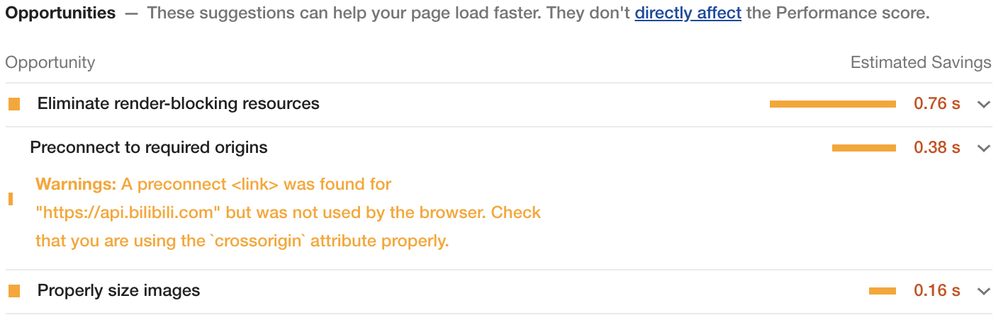 这些可优化项是Audits发现页面中的一些可以直接优化的部分,你可以对照Audits给的这些提示来优化你的Web应用。