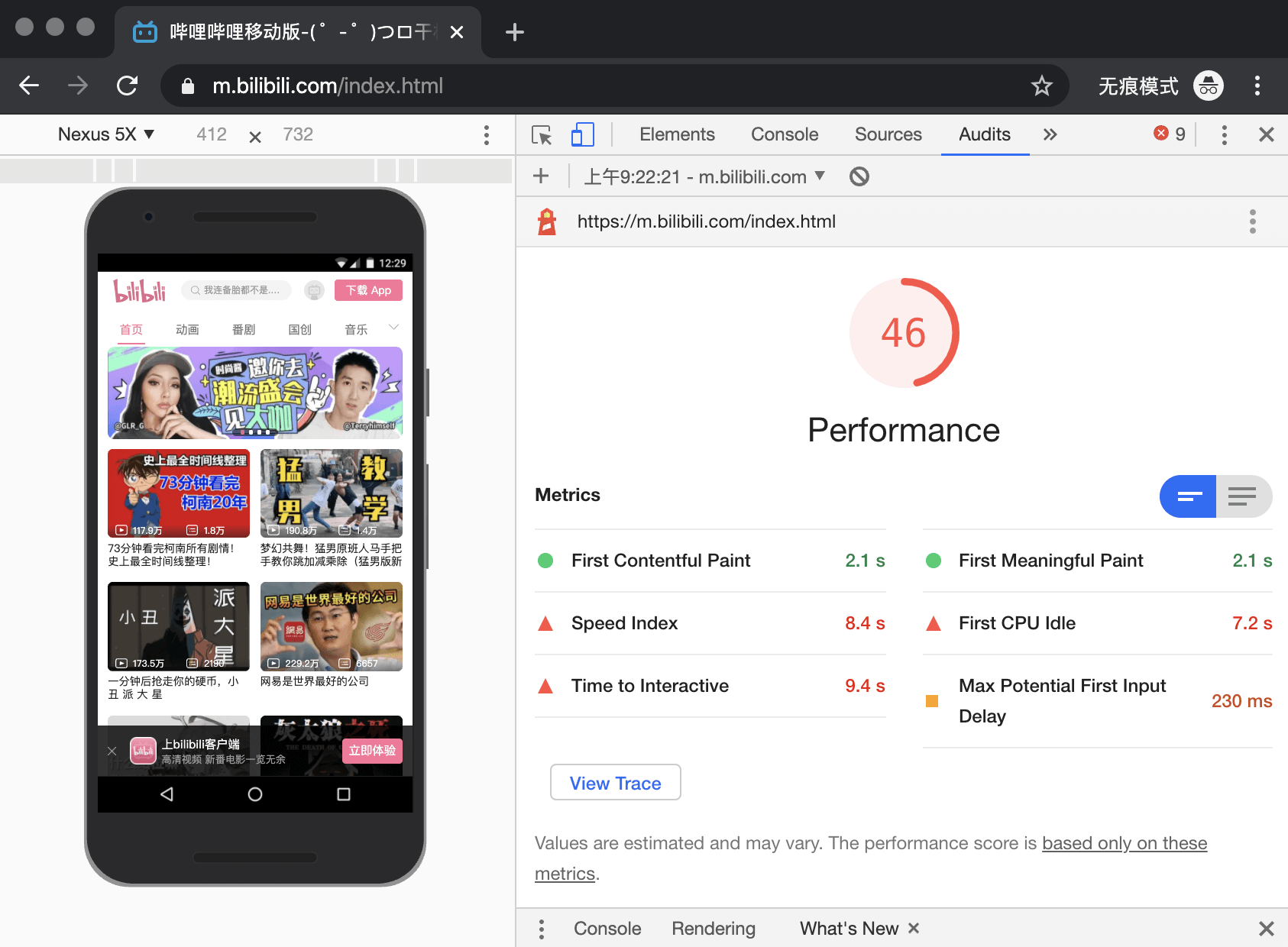 环境准备好了之后,我们就可以生成站点在加载阶段的性能报告了,这里我们可以拿B站作为分析的列子。