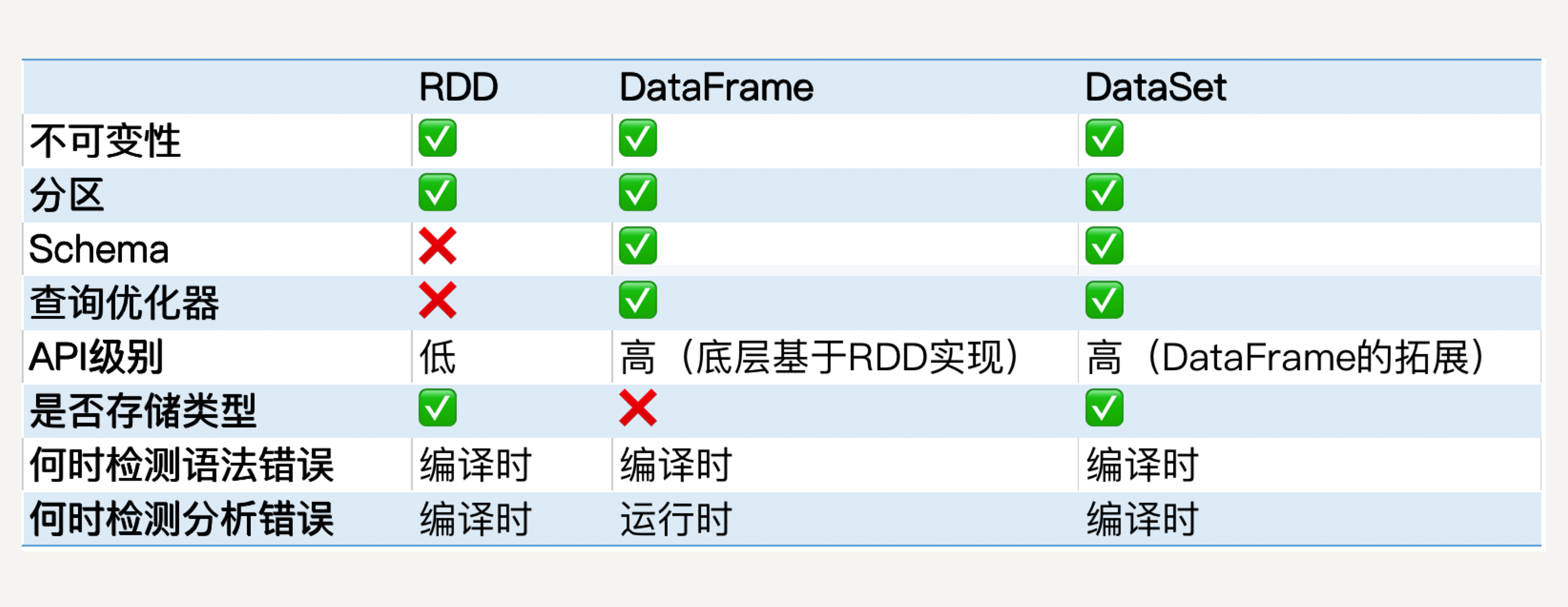 学习Spark到现在,我们已经接触了三种基本的数据结构:RDD、DataFrame和DataSet。接下来你的表格中,你可以看到它们的异同点,思考一下怎样在实际工程中选择。