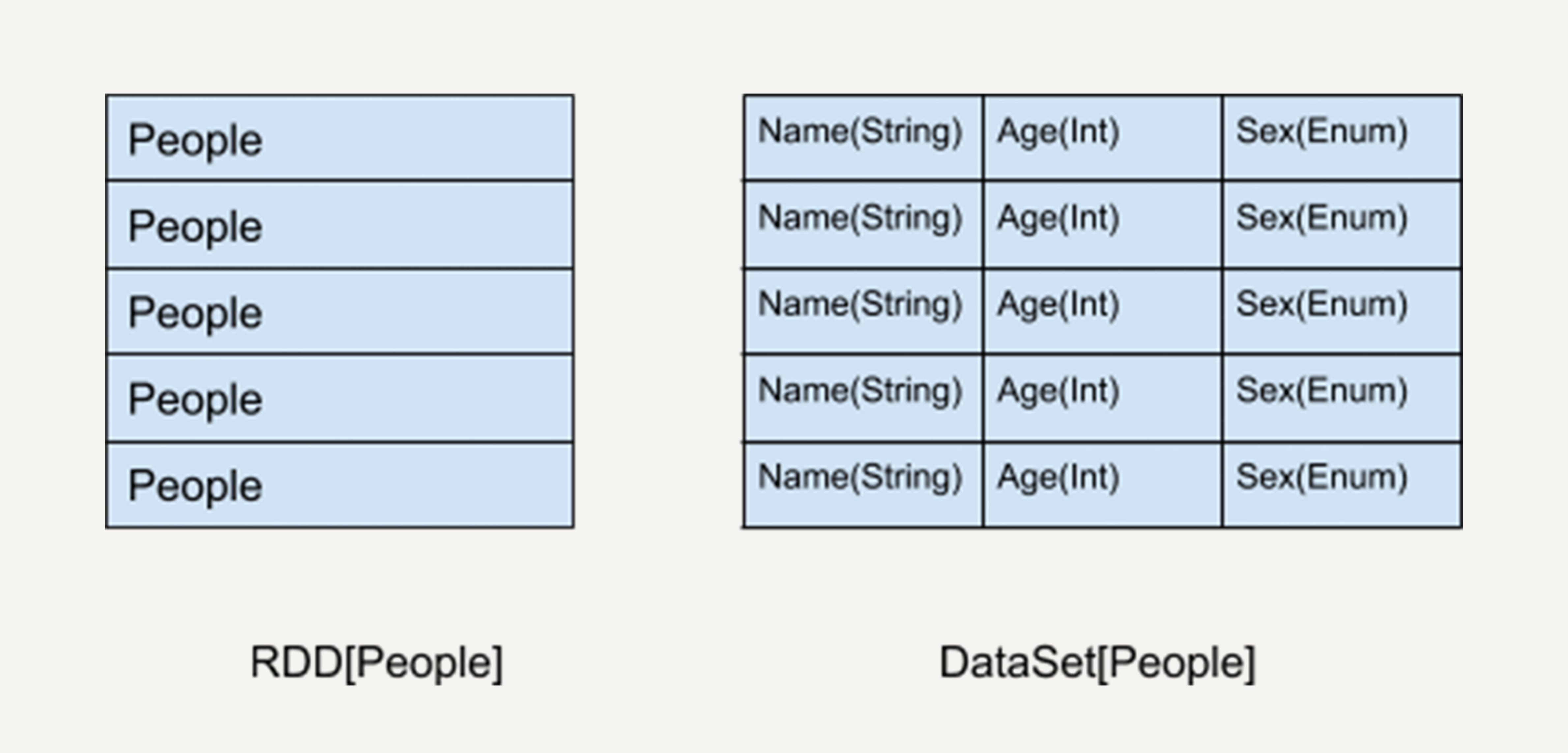 如上图所示,左侧的RDD虽然以People为类型参数,但Spark框架本身不了解People类的内部结构。所有的操作都以People为单位执行。