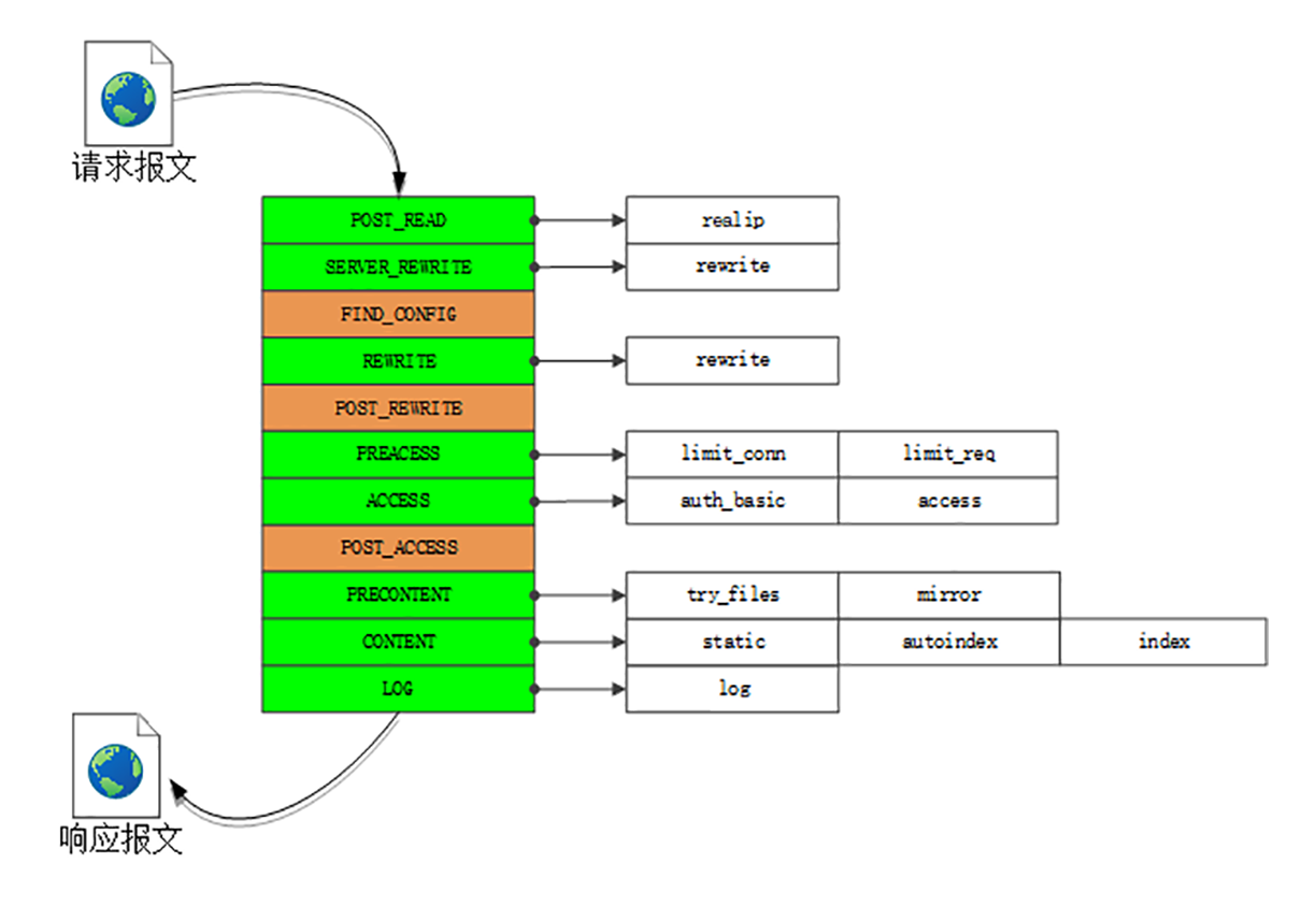 下面的这张图显示了Nginx的“流水线”,在Nginx里的术语叫“阶段式处理”(Phases),一共有11个阶段,每个阶段里又有许多各司其职的模块。