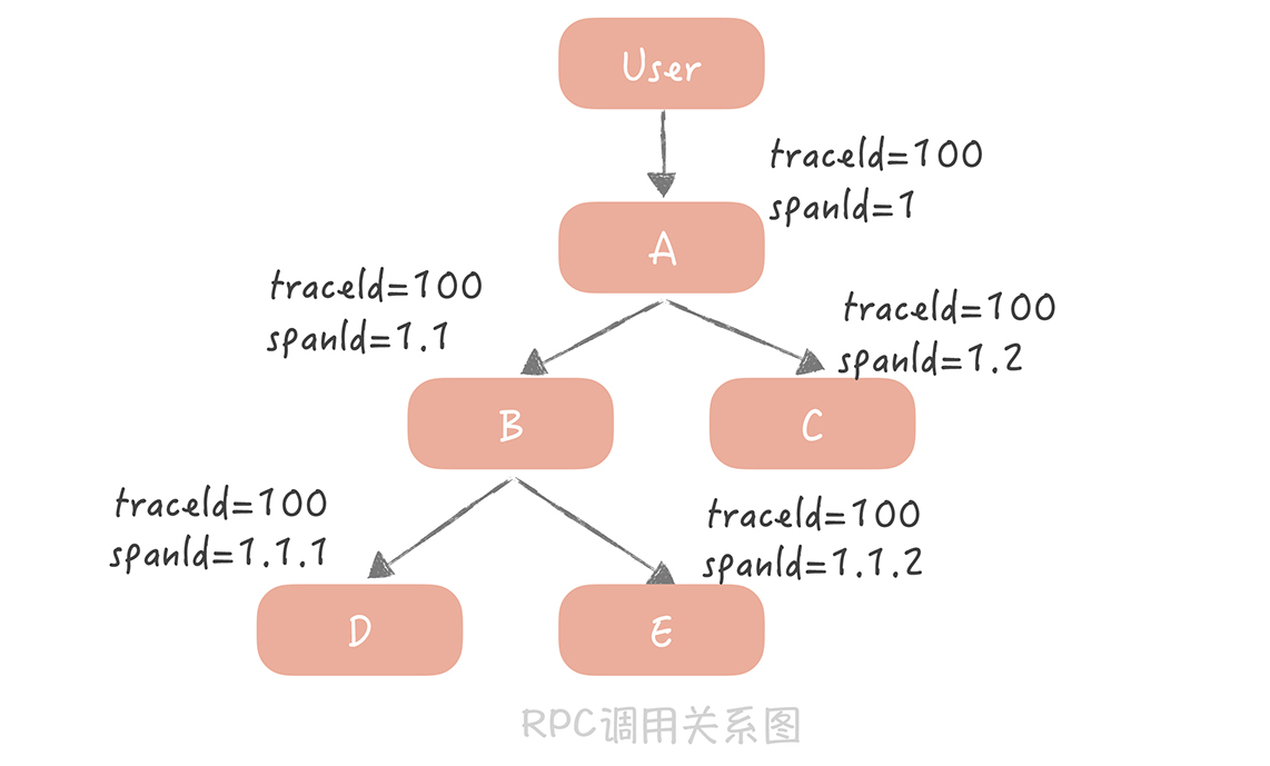 当然,你也可以通过requestId将多个服务器上的日志串起来,但是仅仅依靠requestId很难表达清楚服务之间的调用关系,所以从日志中就无法了解服务之间是谁在调用谁。因此,我们采用traceId + spanId这两个数据维度来记录服务之间的调用关系(这里traceId就是requestId),也就是使用traceId串起单次请求,用spanId记录每一次RPC调用。说起来可能比较抽象,我给你举一个具体的例子。