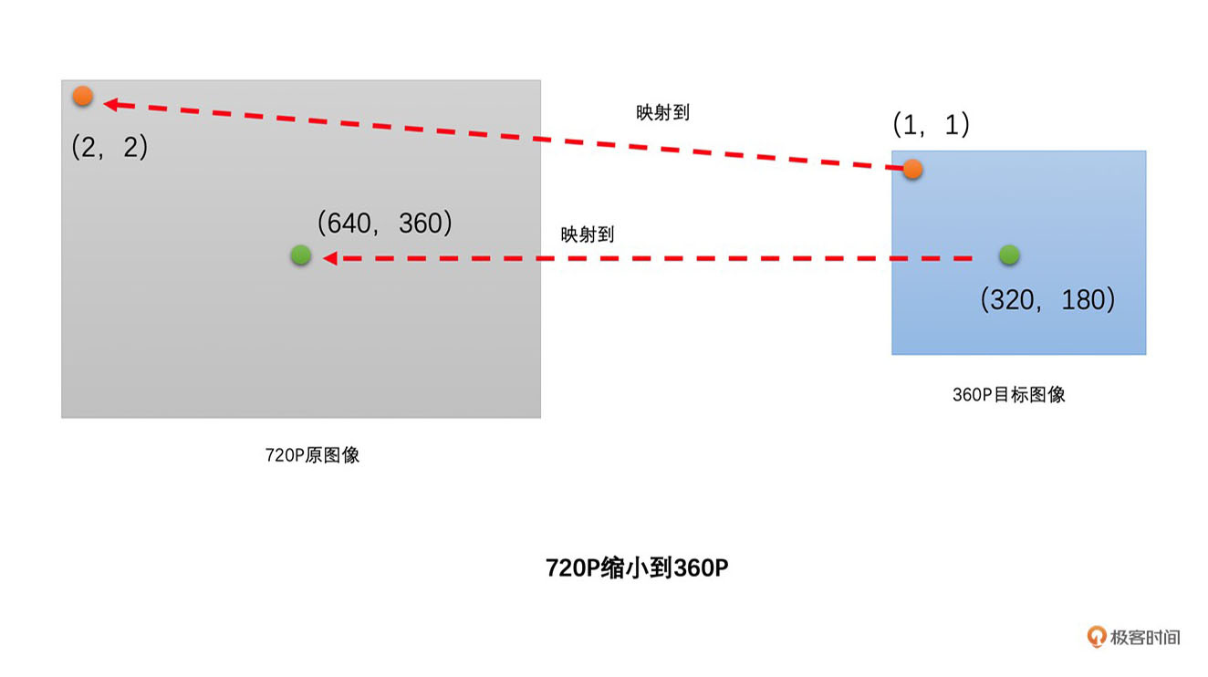 图像缩小的过程也是类似的。对于360P目标图像中的每一个像素点(x,y),我们只需要将它映射到720P原图像的(x * 2,y * 2)位置,通过原图像已有的像素值插值得到(x * 2,y * 2)的像素值就可以了。