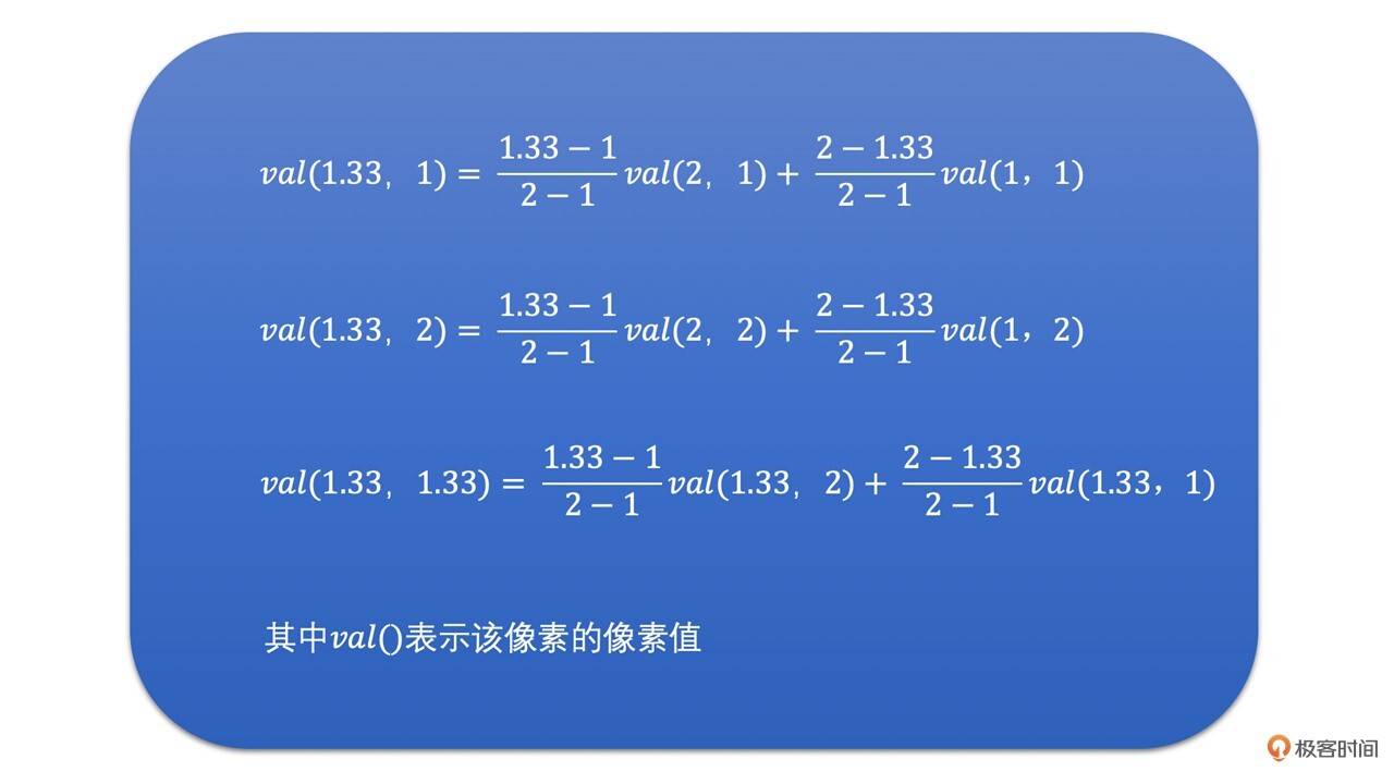 插值求得(1.33,1.33)的值之后,将其赋值给1080P目标图像的(2,2)位置的像素点就可以了。这就是双线性插值的过程。