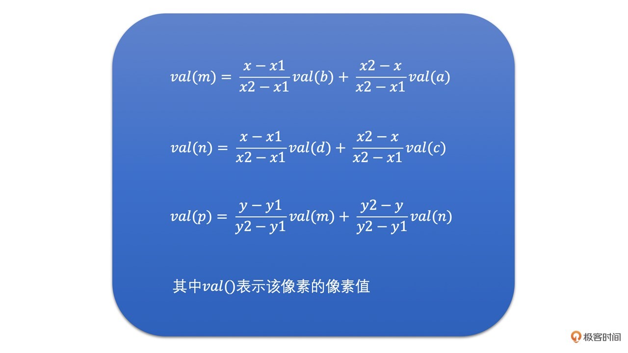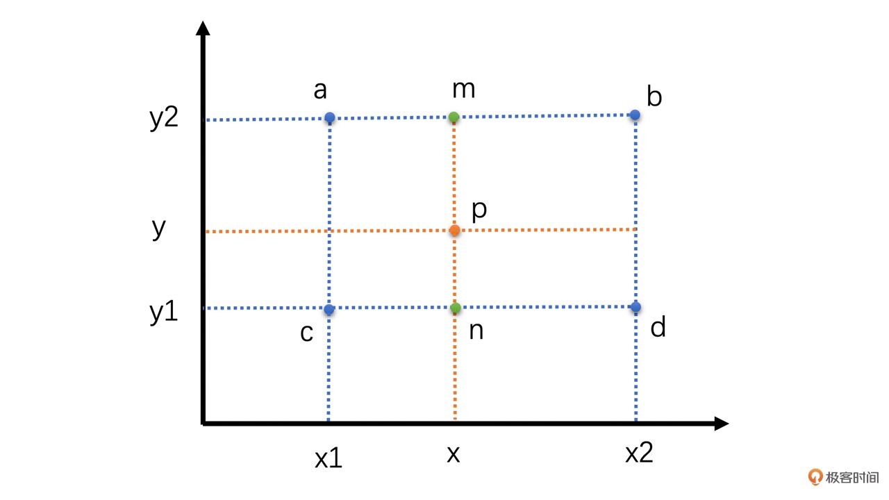 假设我们要插值求的点是p点,其坐标为(x,y)。已知周围4个像素分别是a、b、c、d。我们先通过a和b水平线性插值求得m,再通过c、d水平插值求得n。有了m和n之后,再通过m、n垂直插值求得p点的像素值。计算过程如下: