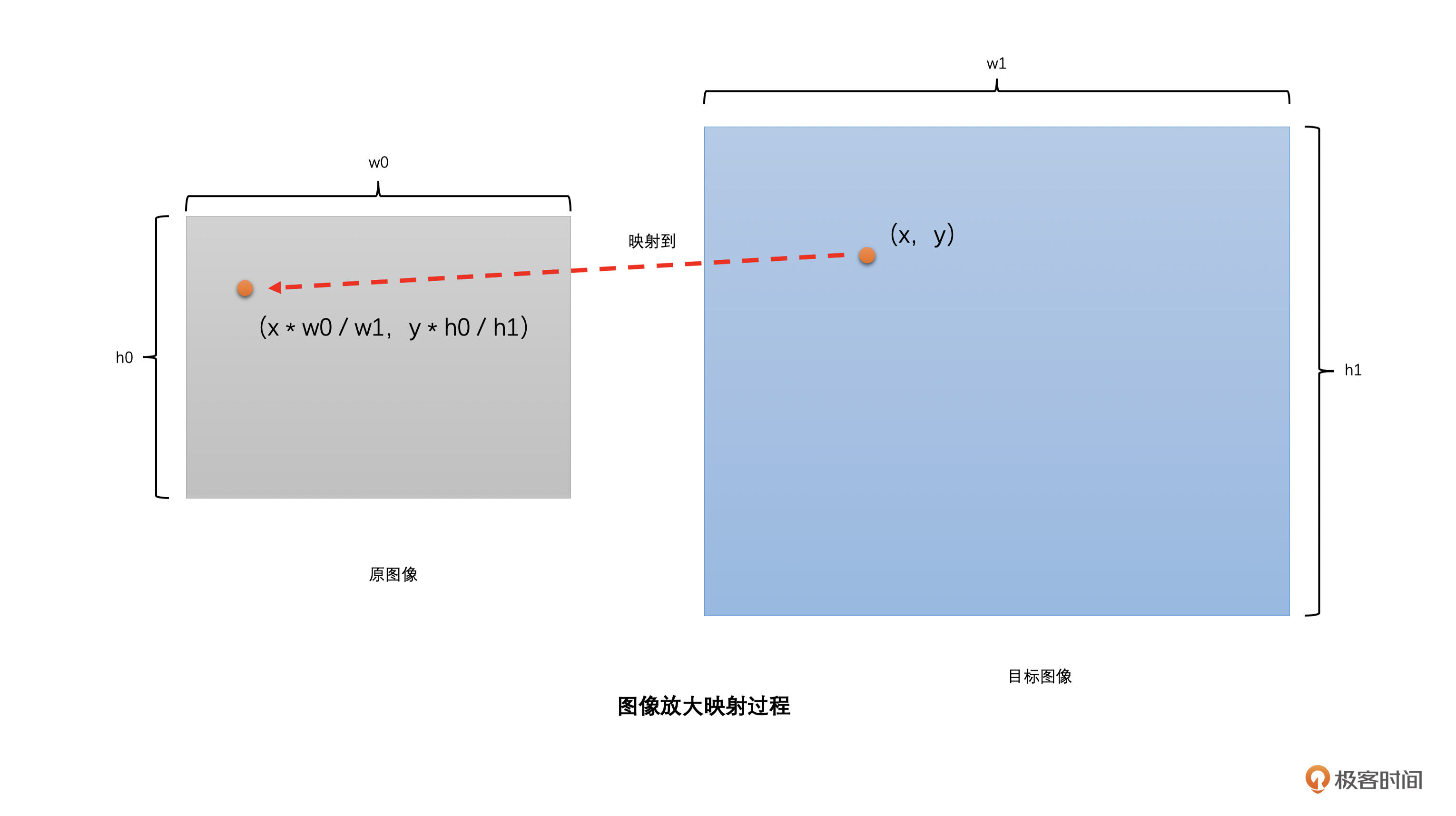 **那怎么通过720P的原图像生成1080P的目标图像呢?**我们先将目标图像的像素位置映射到原图像的对应位置上,然后把通过插值计算得到的原图像对应位置的像素值作为目标图像相应位置的像素值。是不是有点绕?别急,下面我给你举个例子,通过它你就可以更直观地理解这句话的意思了。