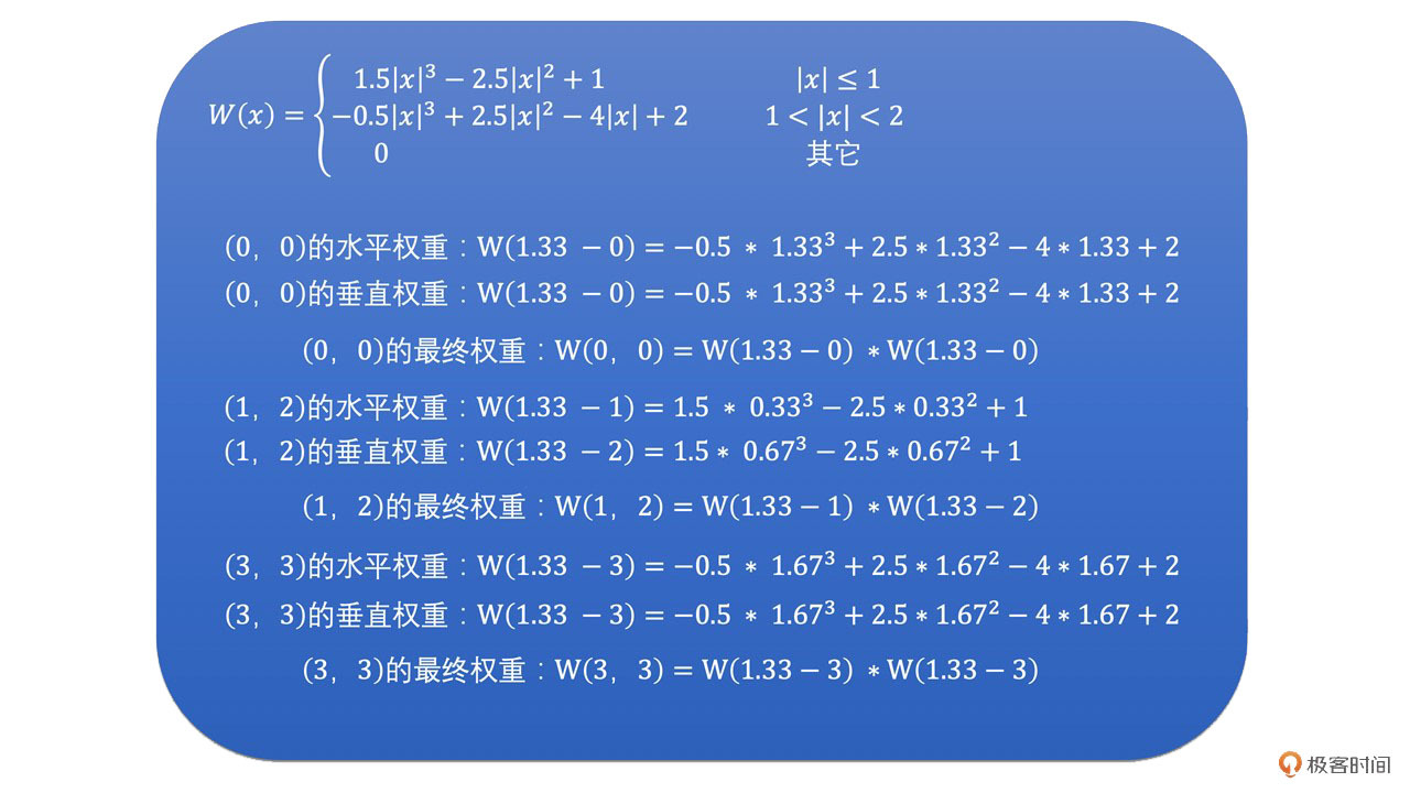 然后,通过BiCubic函数求得每一个点的水平和垂直权重。例如,(0,0)、(1,2)和(3,3)点的水平权重和垂直权重计算方式如下: