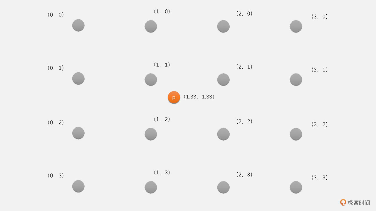 首先,将目标像素点(2,2)映射到原图像的(1.33,1.33)位置,对应下面图中的点p。找到(1.33,1.33)周围的16个像素(0,0)、(1,0)一直到(3,3)。