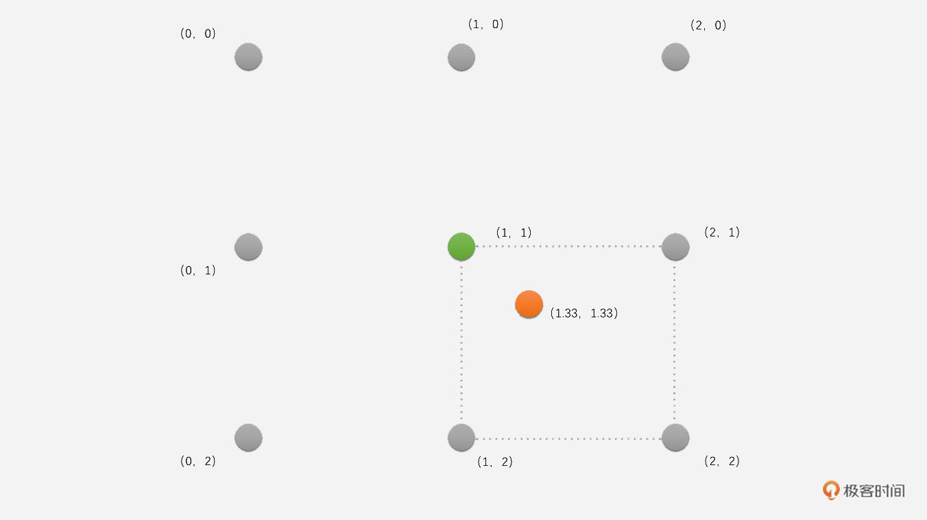 先通过这4个像素插值得到中间像素m和n的像素值。m和n的坐标分别为(1.33,1)和(1.33,2)。通过上面的公式可以求得点p(1.33,1.33)的像素值是: