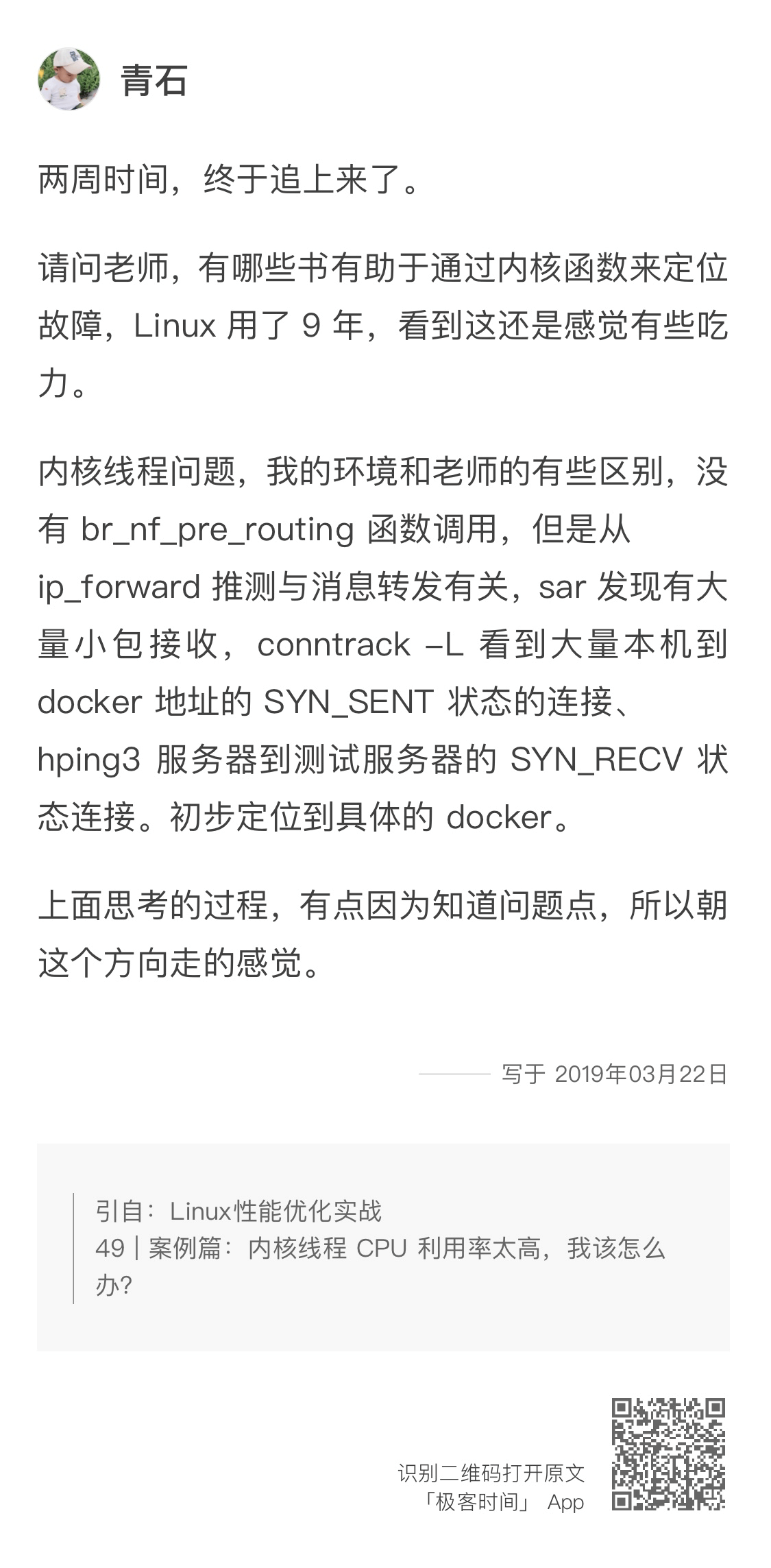 在定位性能问题时,我们通过 perf、ebpf、systemtap 等各种方法排查时,很可能会发现,问题的热点在内核中的某个函数中。而青石和xfan的问题,就是如何去了解、深入 Linux 内核的原理,特别是想弄清楚,性能工具展示的内核函数到底是什么含义。