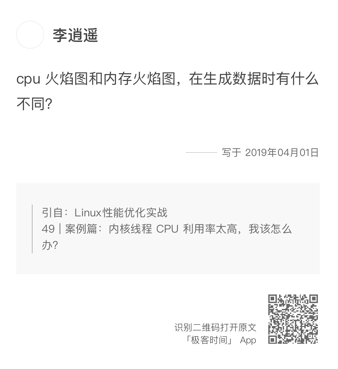 所以,李逍遥同学提了出一个很好的问题:同样都是火焰图,CPU 火焰图和内存火焰图,在生成数据时到底有什么不同?