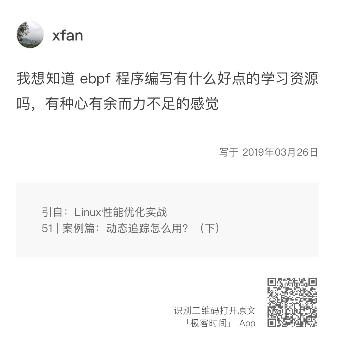此外,对于 eBPF来说,除了可以通过内核源码来了解,我更推荐你从 BPF Compiler Collection (BCC) 这个项目开始。BCC 提供了很多短小的示例,可以帮你快速了解 eBPF 的工作原理,并熟悉 eBPF 程序的开发思路。了解这些基本的用法后,再去深入 eBPF 的内部,就会轻松很多。
