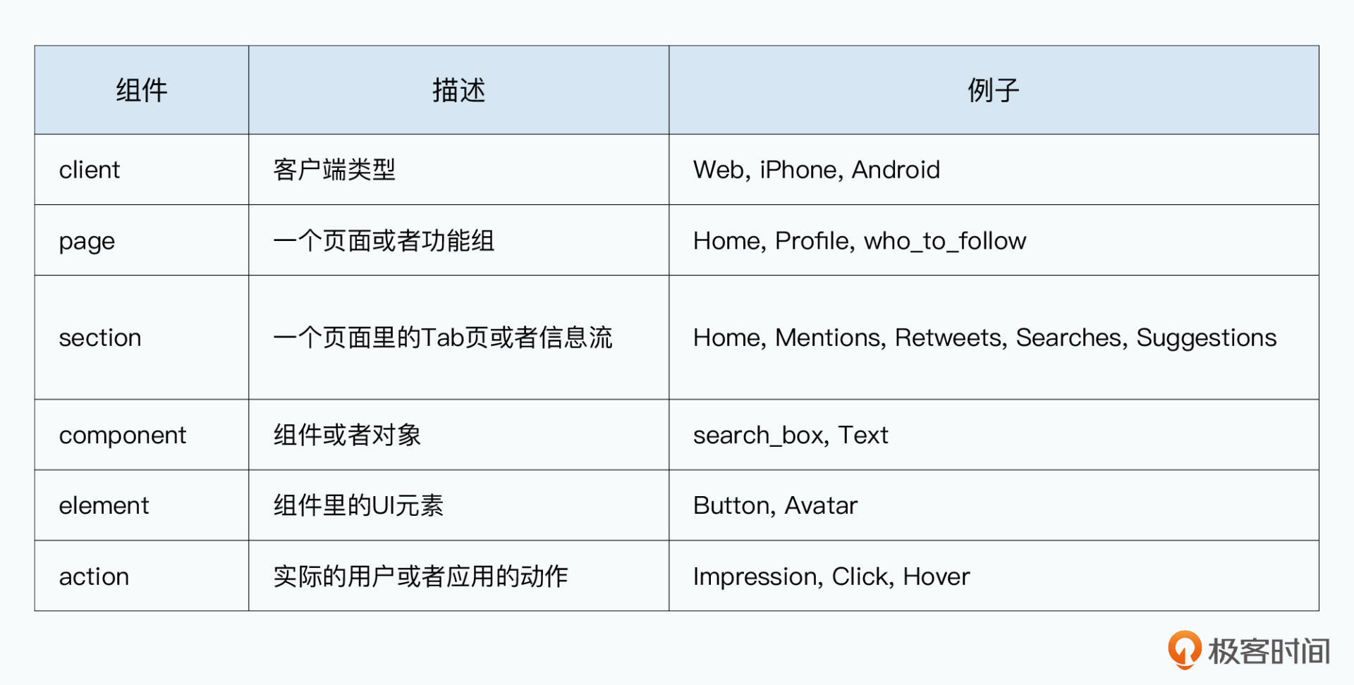 首先,Twitter把用户在Twitter内的所有用户行为,拆分成了一个固定的 6个层级的结构,Twitter称之为 Click Events。这6个层级,分别是来自于什么客户端(client),是客户端里的哪一个页面(page),是页面里的哪一个Tab页(section),是Tab页里的哪一个组件(component),是组件里的哪一个元素(element),以及针对这个元素用户的动作(action)是什么。