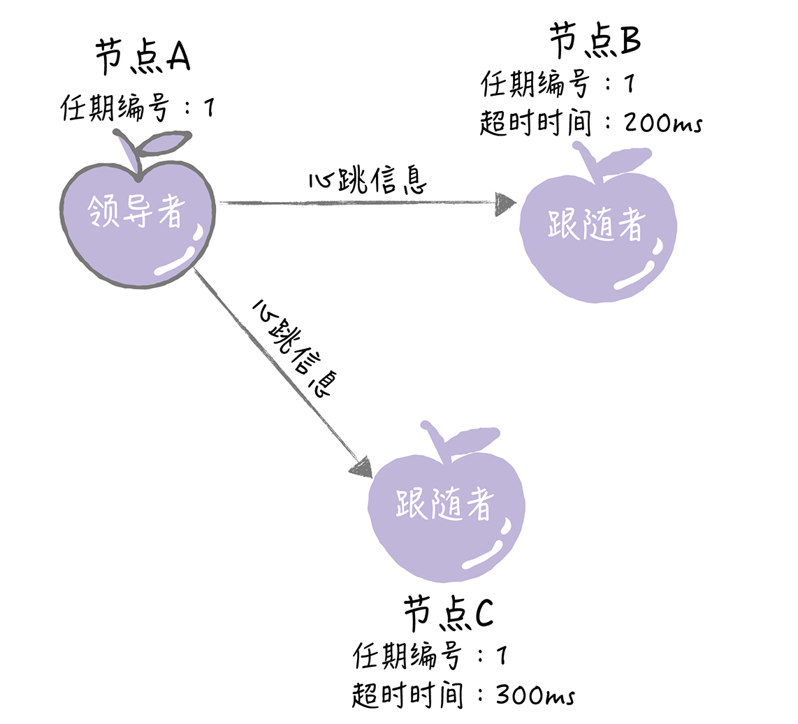 节点A当选领导者后,他将周期性地发送心跳消息,通知其他服务器我是领导者,阻止跟随者发起新的选举,篡权。