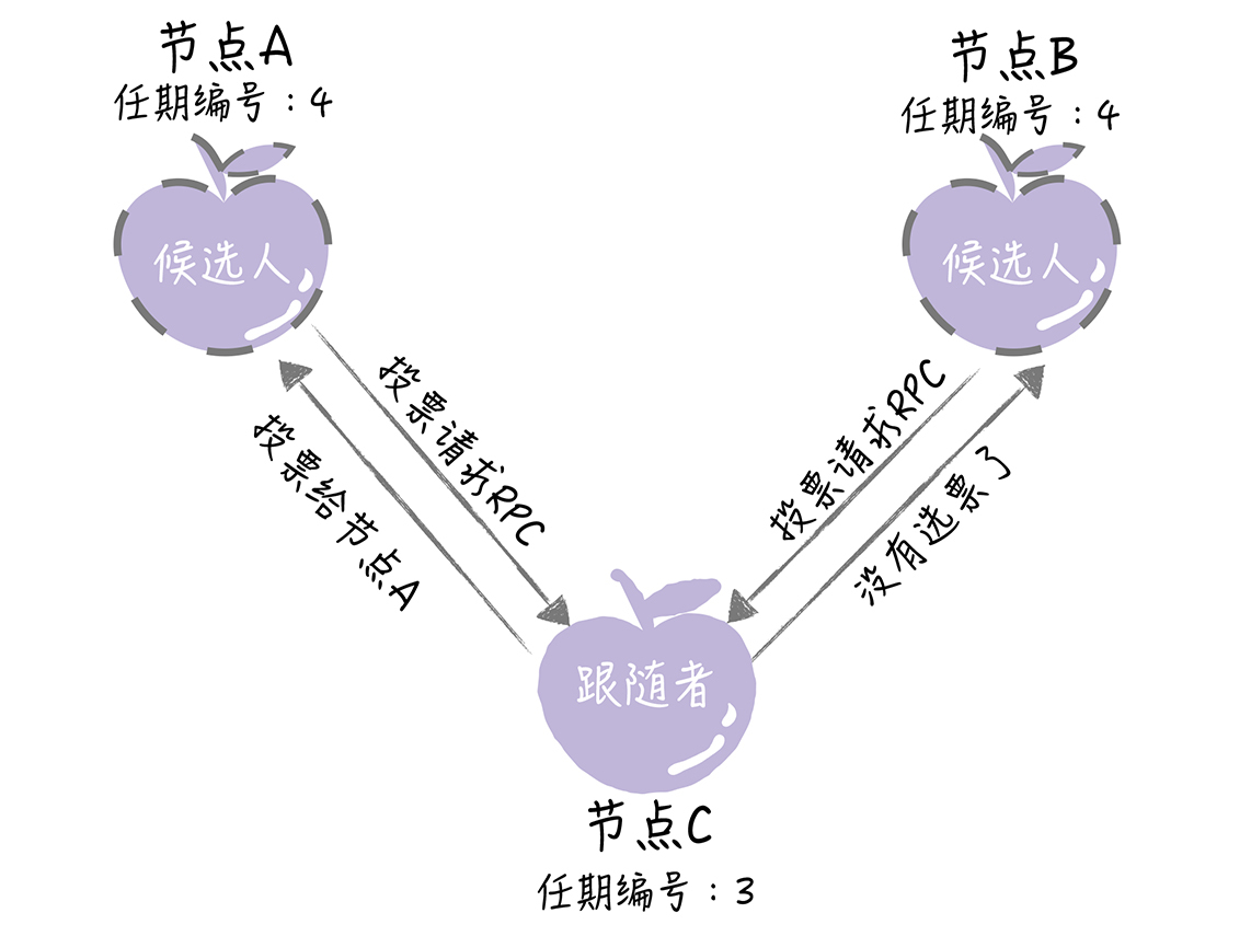 - 日志完整性高的跟随者(也就是最后一条日志项对应的任期编号值更大,索引号更大),拒绝投票给日志完整性低的候选人。比如节点B的任期编号为3,节点C的任期编号是4,节点B的最后一条日志项对应的任期编号为3,而节点C为2,那么当节点C请求节点B投票给自己时,节点B将拒绝投票。