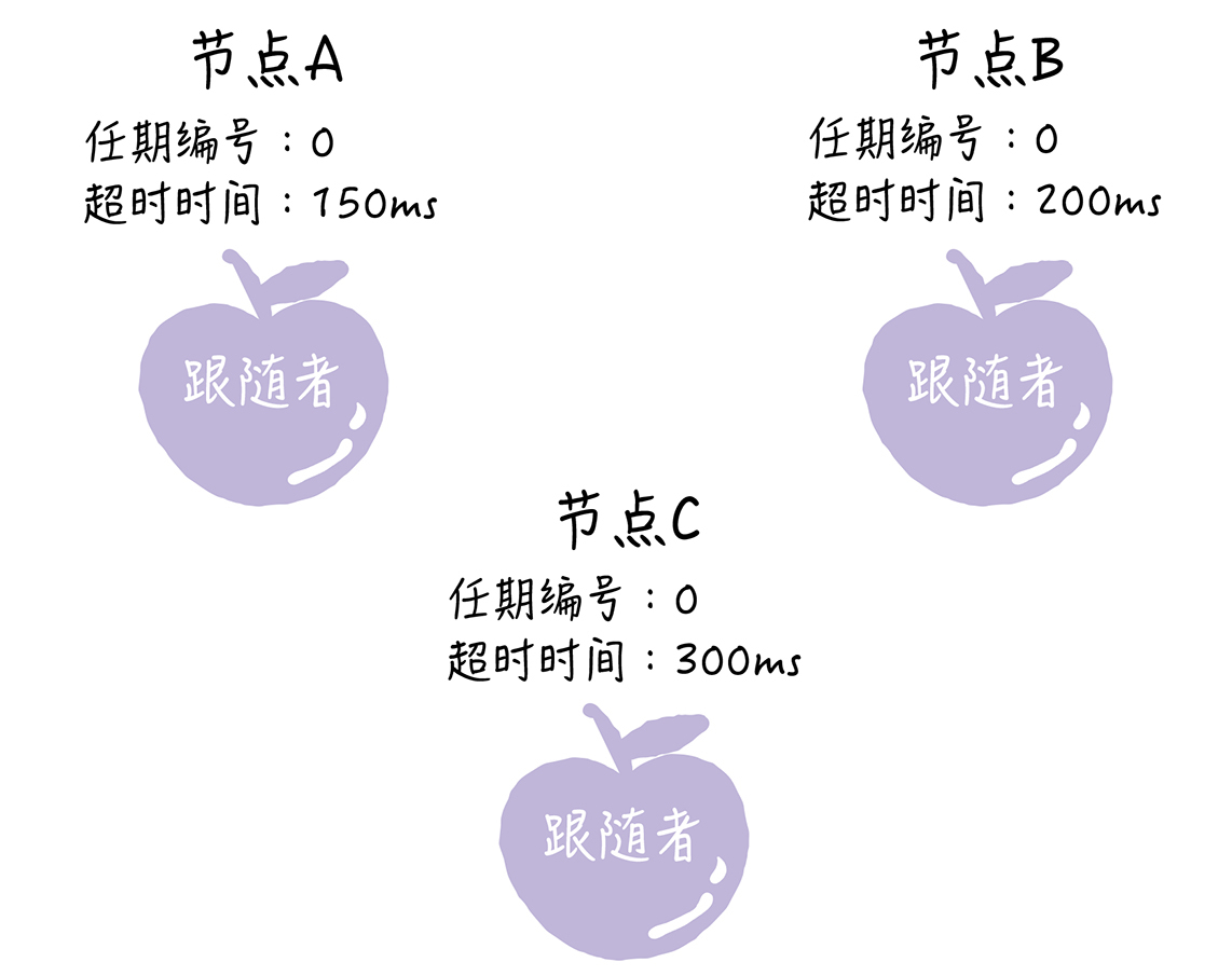 Raft算法实现了随机超时时间的特性。也就是说,每个节点等待领导者节点心跳信息的超时时间间隔是随机的。通过上面的图片你可以看到,集群中没有领导者,而节点A的等待超时时间最小(150ms),它会最先因为没有等到领导者的心跳信息,发生超时。