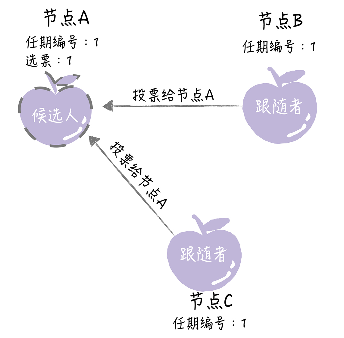 如果其他节点接收到候选人A的请求投票RPC消息,在编号为1的这届任期内,也还没有进行过投票,那么它将把选票投给节点A,并增加自己的任期编号。
