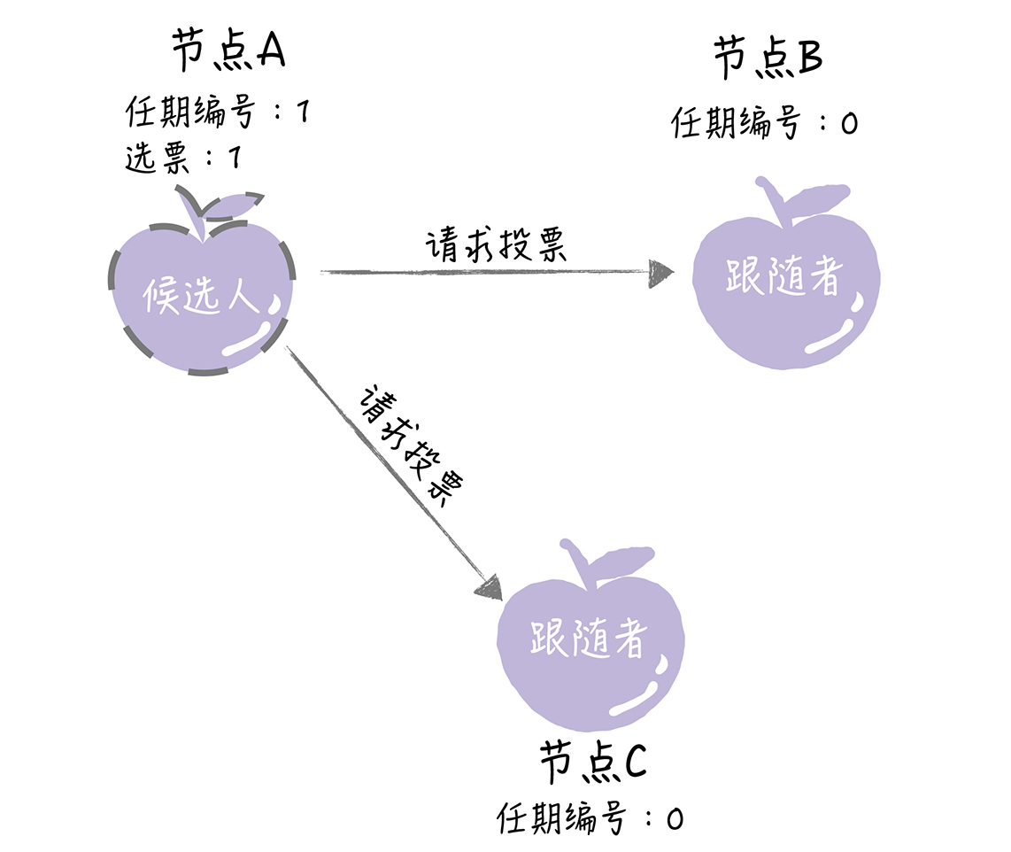 这个时候,节点A就增加自己的任期编号,并推举自己为候选人,先给自己投上一张选票,然后向其他节点发送请求投票RPC消息,请它们选举自己为领导者。