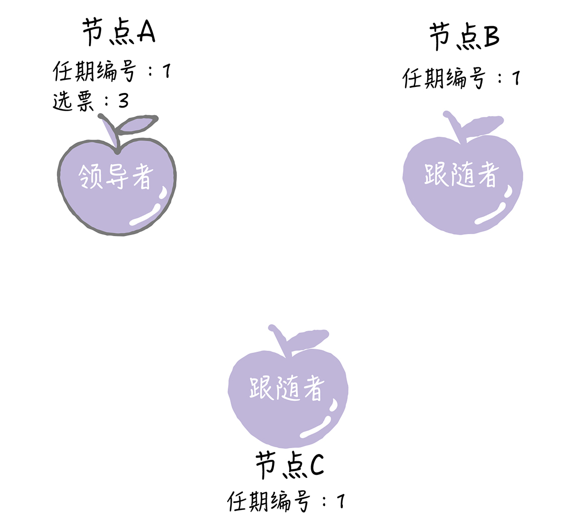 那么这三个成员是怎么选出来领导者的呢?为了方便你理解,我以图例的形式演示一个典型的领导者选举过程。