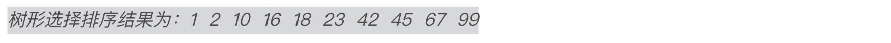 | int arr[] = {16,1,45,23,99,2,18,67,42,10}; int length = sizeof(arr) / sizeof(arr[0]); //数组中元素个数 TreeSelSort(arr, length);//对数组元素进行树形选择排序 cout <<"树形选择排序结果为:"; for (int i = 0; i < length; ++i) { cout << arr[i] <<""; } cout << endl; //换行