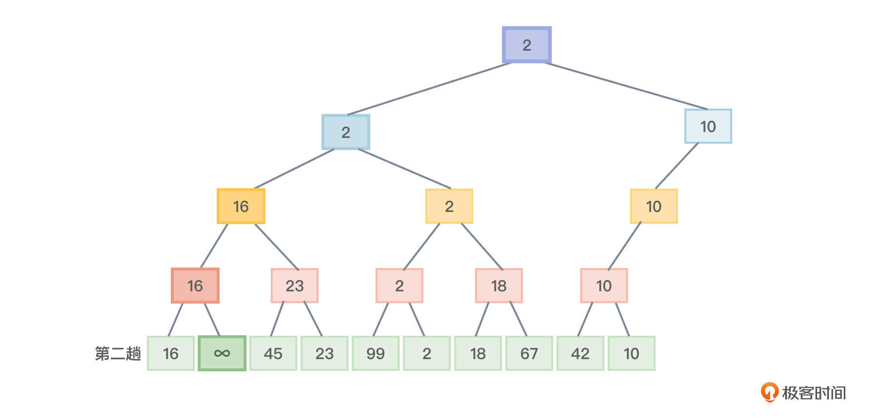 图2还是从下向上观察,这是第二趟排序,前面挑选出的最小值1已经找了个地方保存,这里直接把1的值修改为一个最大值∞,这样,对节点进行两两比较时,标记为最大值的节点就不可能被选中。第二趟排序需要进行什么比较呢?