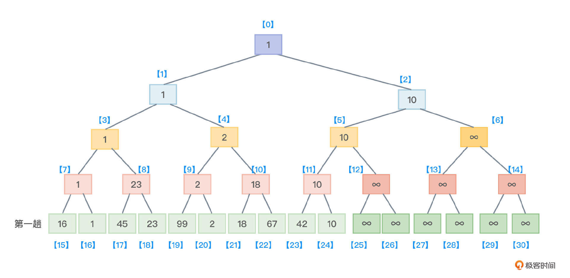 回忆一下二叉树的性质5——具有n(n>0)个节点的完全二叉树的高度为 ⌈$log_{2}^{n+1}$⌉ 或者 ⌊$log_{2}^{n}$⌋ +1。同时,你也需要知道,含有n个叶子节点的完全二叉树的高度是 ⌈$log_{2}^{n}$⌉ +1。以这个理论为指导(为了能够正确编写出代码),绘制一下更详细的树形选择排序示意图。依旧以数组 { 16,1,45,23,99,2,18,67,42,10 } 举例来解释树形选择排序。