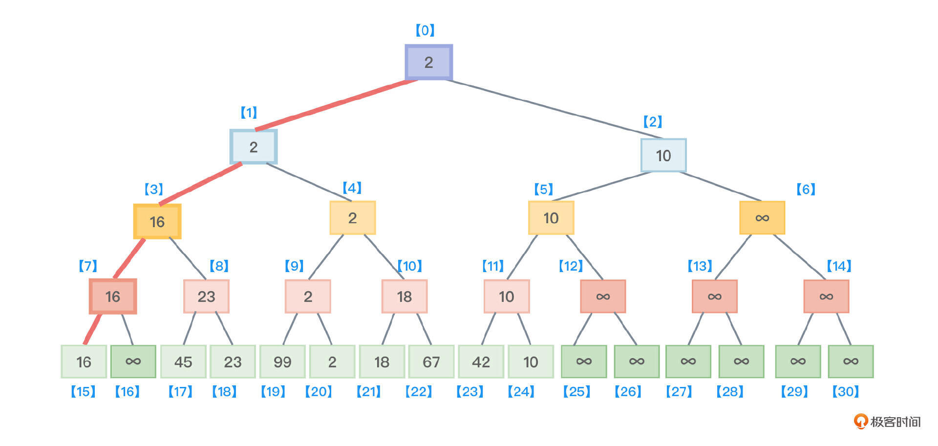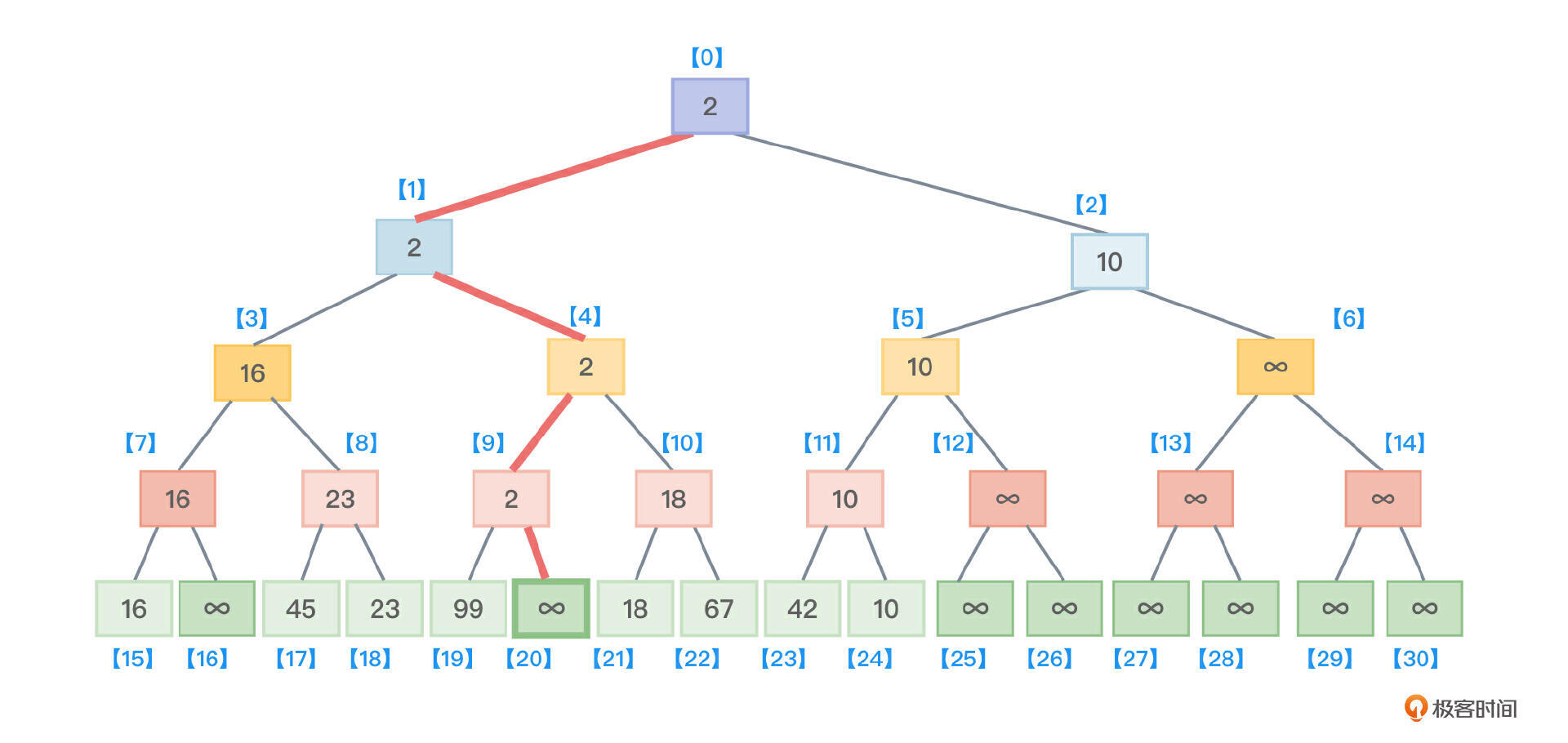 - 接着,沿着根节点向叶子节点找,找到了最小值2所在的叶子节点,把该叶子节点的值从原来保存的2修改为最大值 ∞,如图6所示。