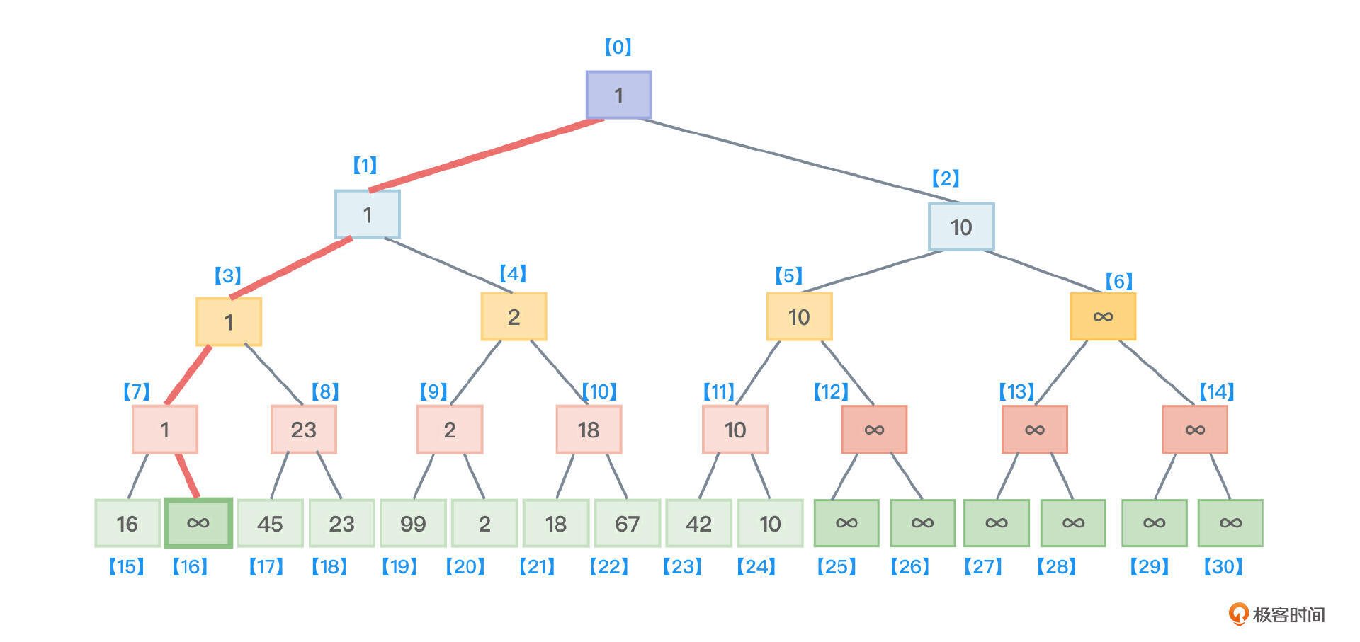 - 接着,沿着根节点向叶子节点找,找到了最小值1所在的叶子节点,把该叶子节点的值从原来保存的1修改为最大值 ∞,如图4所示。