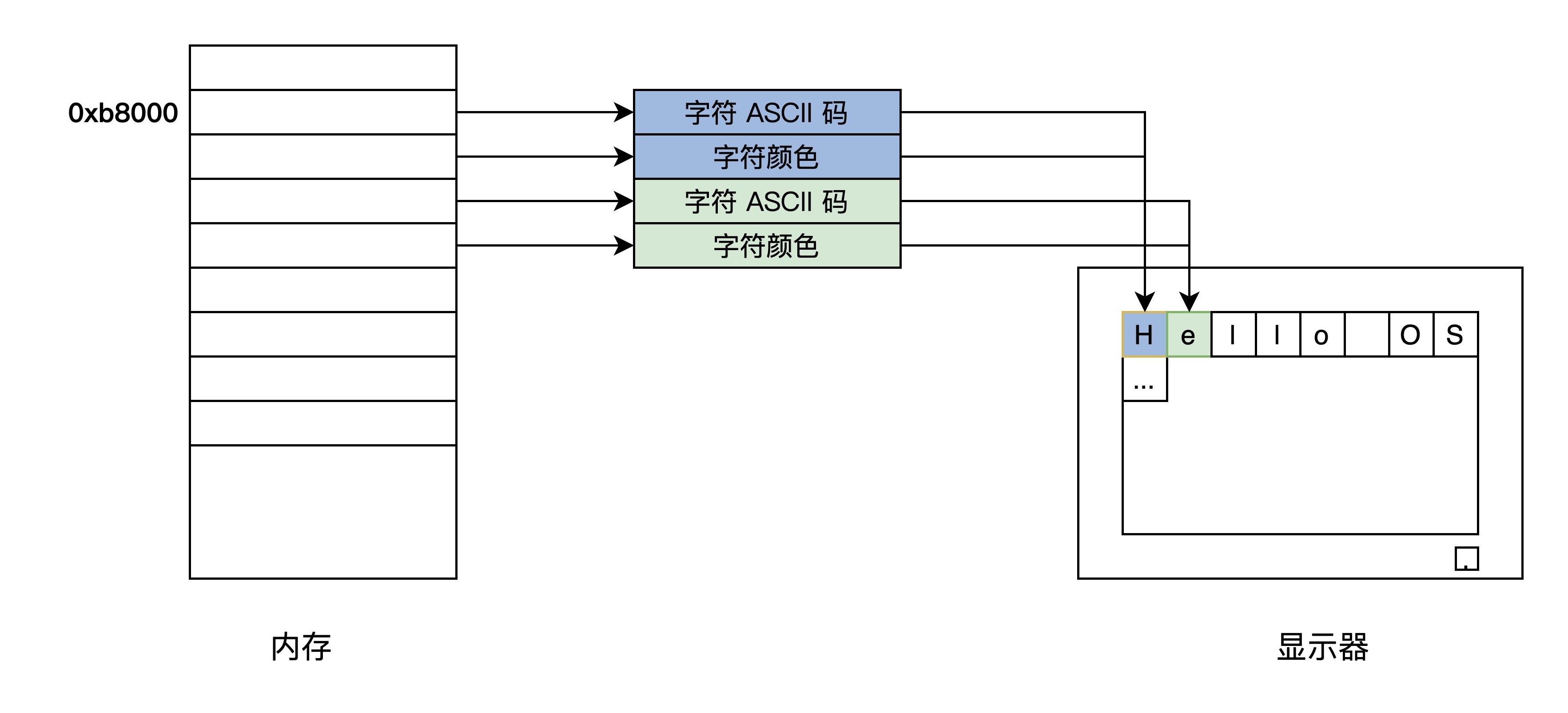它把屏幕分成24行,每行80个字符,把这(24*80)个位置映射到以0xb8000地址开始的内存中,每两个字节对应一个字符,其中一个字节是字符的ASCII码,另一个字节为字符的颜色值。如下图所示: