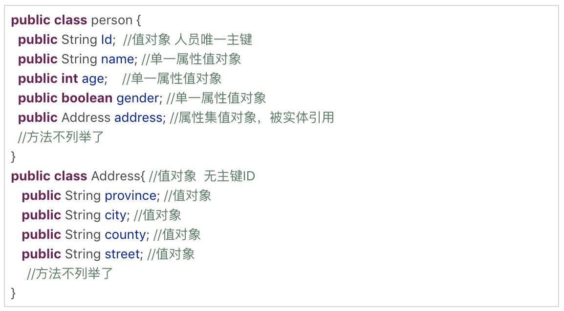 我们看一下下面这段代码,person这个实体有若干个单一属性的值对象,比如Id、name等属性;同时它也包含多个属性的值对象,比如地址address。