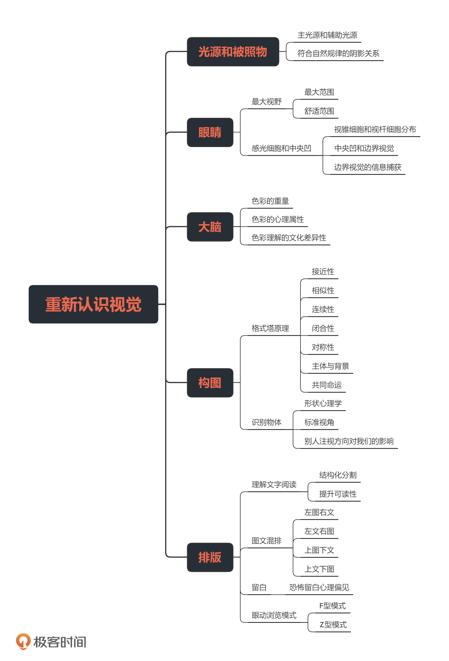 重新认识视觉部分的内容偏多,我足足用了三节课,才系统地给你呈现出一个相对完整的人因学知识点。我总结了一个脑图,你可以长按保存下来,帮助你在这个知识点上有清晰系统的认知。